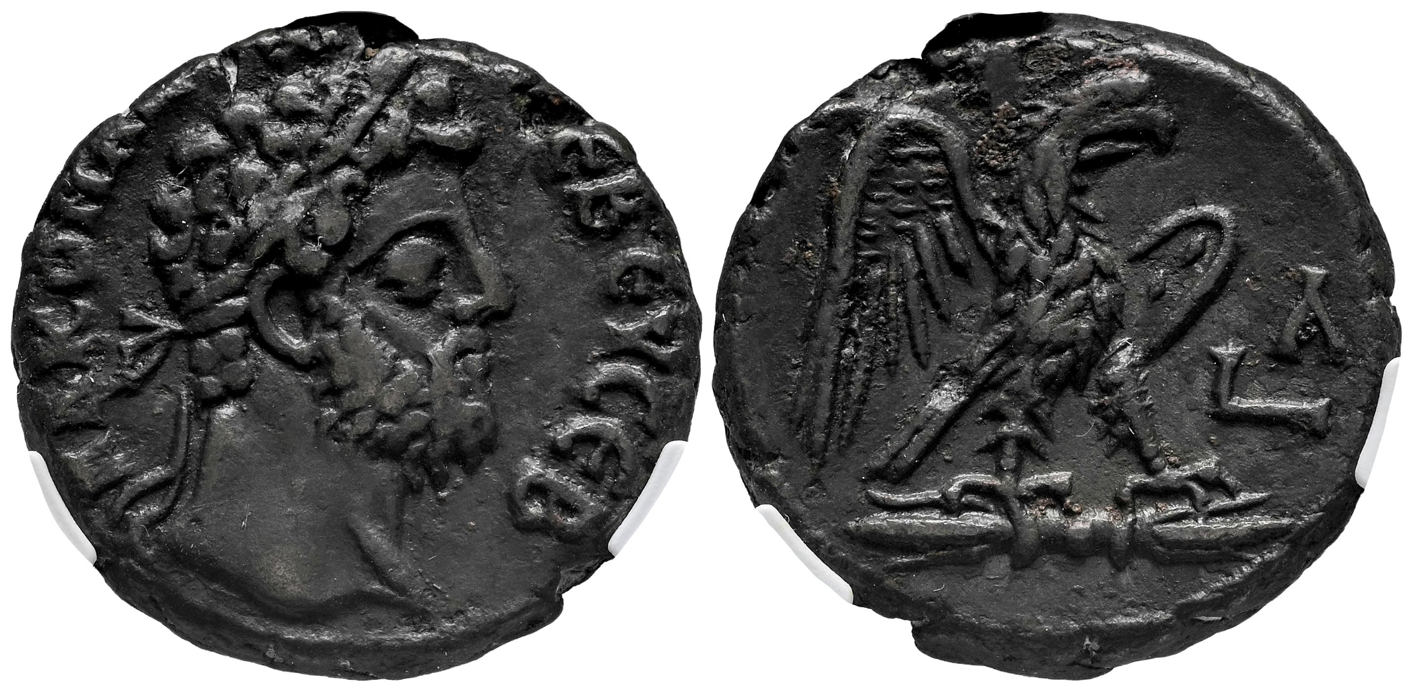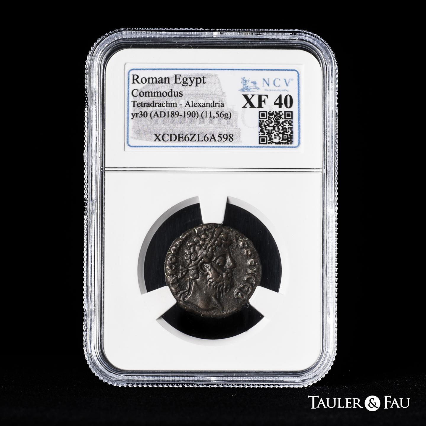 Cómodo. Tetradracma. RY 30 = 189/90 d.C. Alejandría. Egipto. (RPC-IV 4 Online 14223). (Dattari (Savio)-3905). (Emmett-2523). Anv.: M A KOM ANTѠ CЄB ЄYCЄB. Cabeza laureada a la derecha. Rev.: Águila con alas extendidas en pie a la derecha sobre un rayo; L Λ (fecha) en el campo derecho. Ve. 11,56 g. Encapsulada por NCV como XF 40. NCV-XF. Est...160,00.