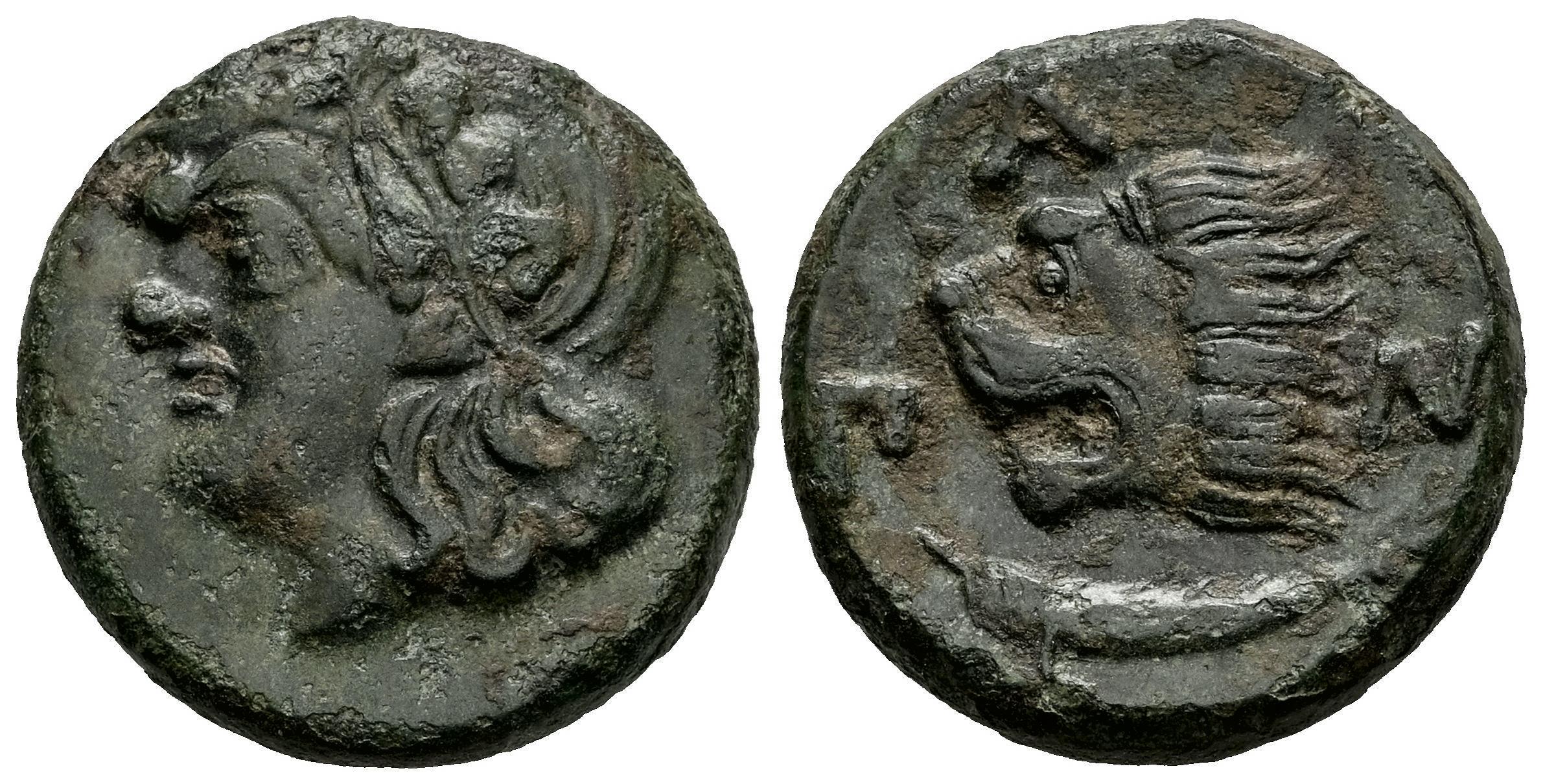 Bósforo Cimmerio. Pantikapaion. AE 20. 310-304/3 a.C. (SNG Stancomb-552). (MacDonald-70). (Hgc-7, 114). Anv.: Cabeza de sátiro imberbe a la izquierda, con corona de hiedra. Rev.: Π-Α-Ν alrededor de la cabeza de un león rugiente a la izquierda; esturión a la izquierda debajo. Ae. 6,89 g. Ex Áureo & Calicó 248 (26/05/2020), lote 1013. MBC+. Est...100,00.