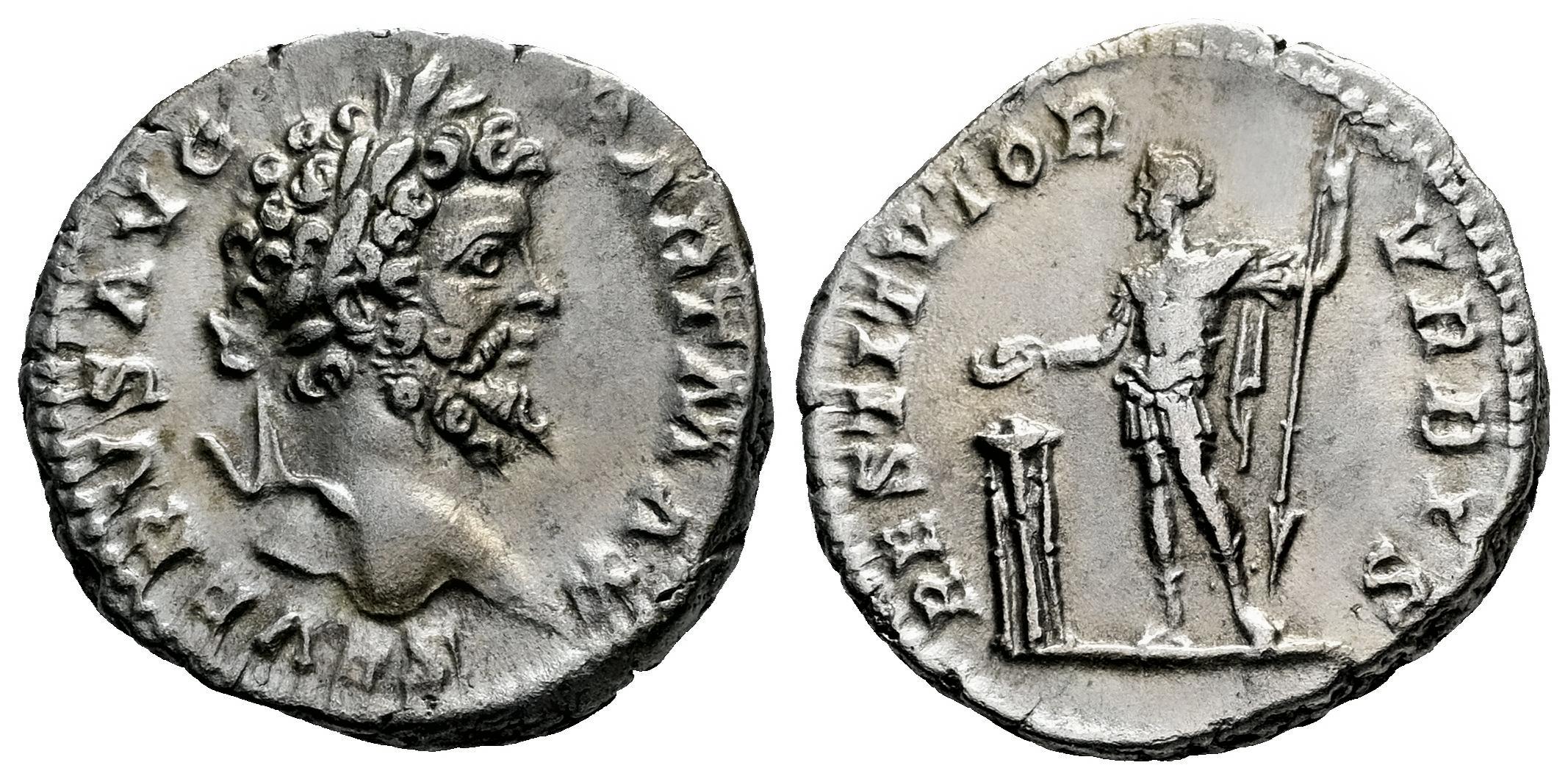 Septimio Severo. Denario. 200-201 d.C. Roma. (Ric-IV 167a). (Bmcre-203). (Rsc-599). Anv.: SEVERVS AVG PART MAX. Cabeza laureada a la derecha. Rev.: RESTITVTOR VRBIS. Emperador en pie a la izquierda, sacrificando con una patera sobre un trípode y sosteniendo una lanza. Ag. 3,54 g. MBC+/MBC. Est...120,00.