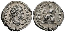 Septimio Severo. Denario. 202-210 d.C. Roma. (Ric-IV 288). (Bmc-361). (Rsc-606). Anv.: SEVERVS PIVS AVG. Cabeza laureada a derecha. Rev.: RESTITVTOR VRBIS. Roma sentada a la izquierda en el escudo, sosteniendo el paladio y una lanza invertida. Ag. 4,13 g. Pátina. EBC-/MBC+. Est...120,00.