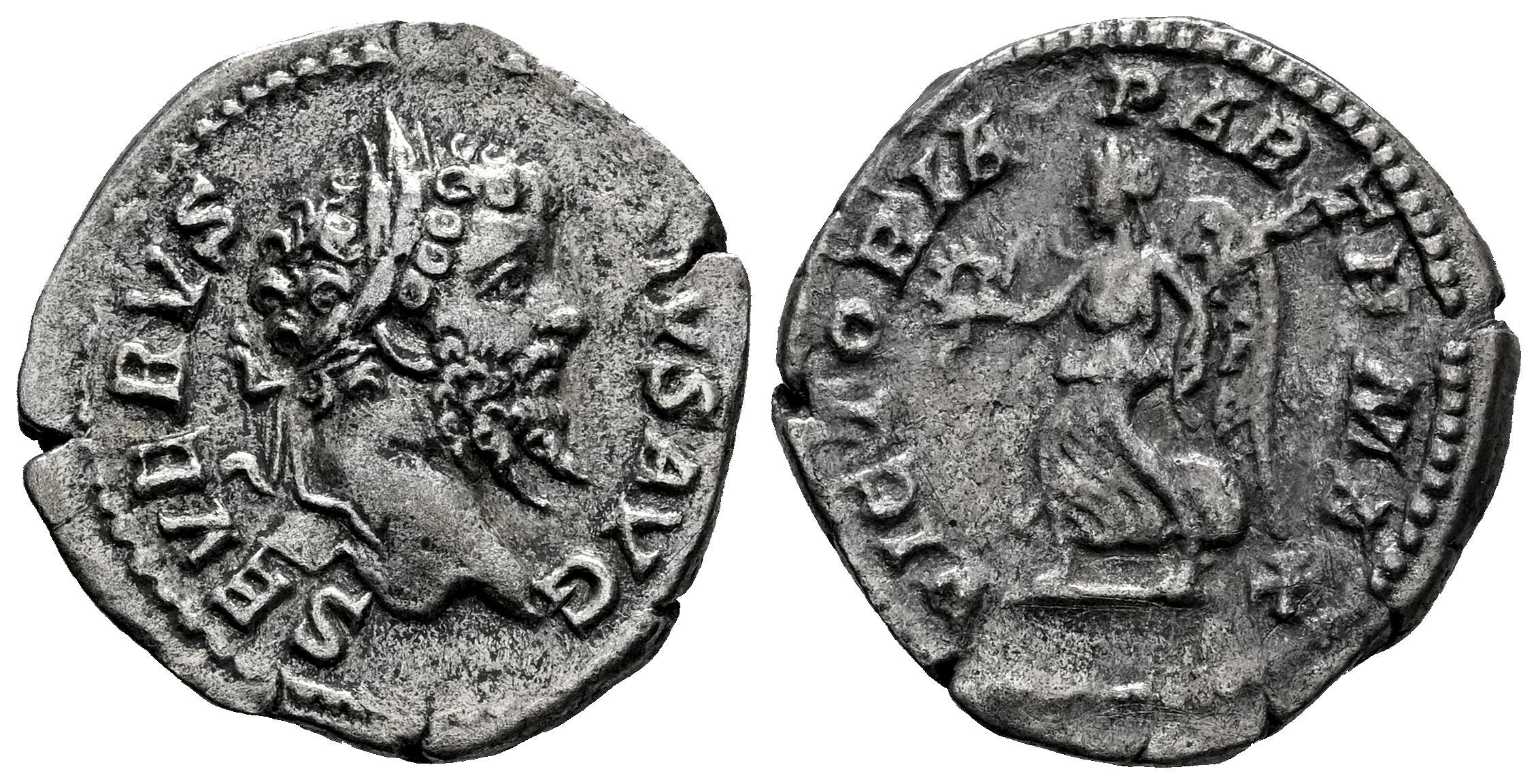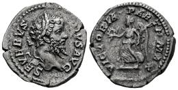 Septimio Severo. Denario. 193-211 d.C. Roma. (Ric-IV 296). Anv.: SEVERVS PIVS AVG. Cabeza laureada a la derecha. Rev.: VICTORIA PARTH MAX. Victoria avanzando hacia la izquierda, sosteniendo corona y palma. Ag. 3,19 g. MBC/MBC-. Est...80,00.