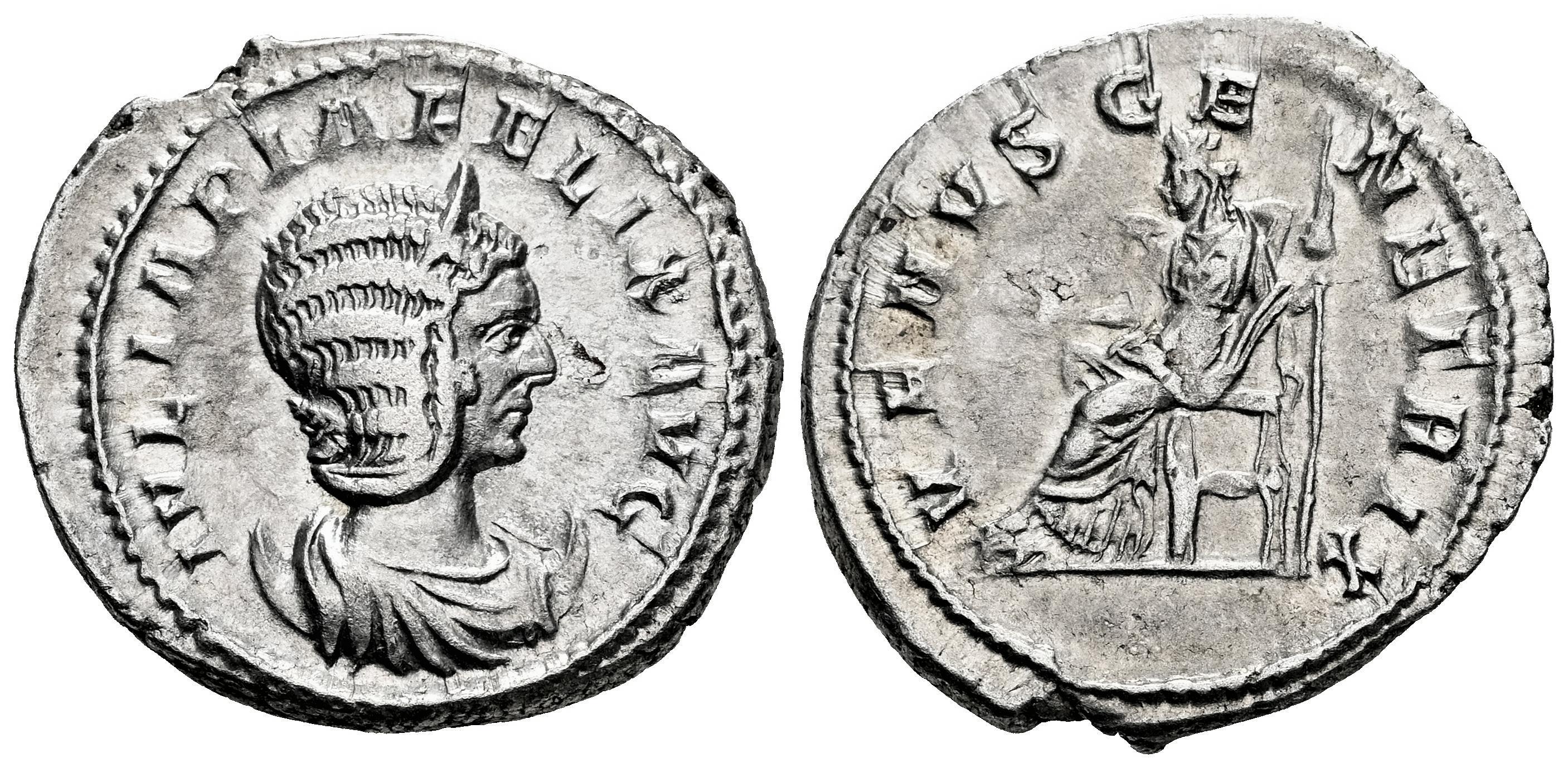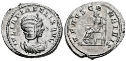 Julia Domna. Antoniniano. 211-217 d.C. Roma. (Ric-IV 288a). (Bmcre-22). (Rsc-211). Anv.: IVLIA PIA FELIX AVG. Busto con diadema y drapeado a la derecha. Rev.: VENVS GENETRIX. Venus sedente a la izquierda, mano extendida y sosteniendo cetro. Ag. 5,30 g. Buen ejemplar. EBC-. Est...150,00.