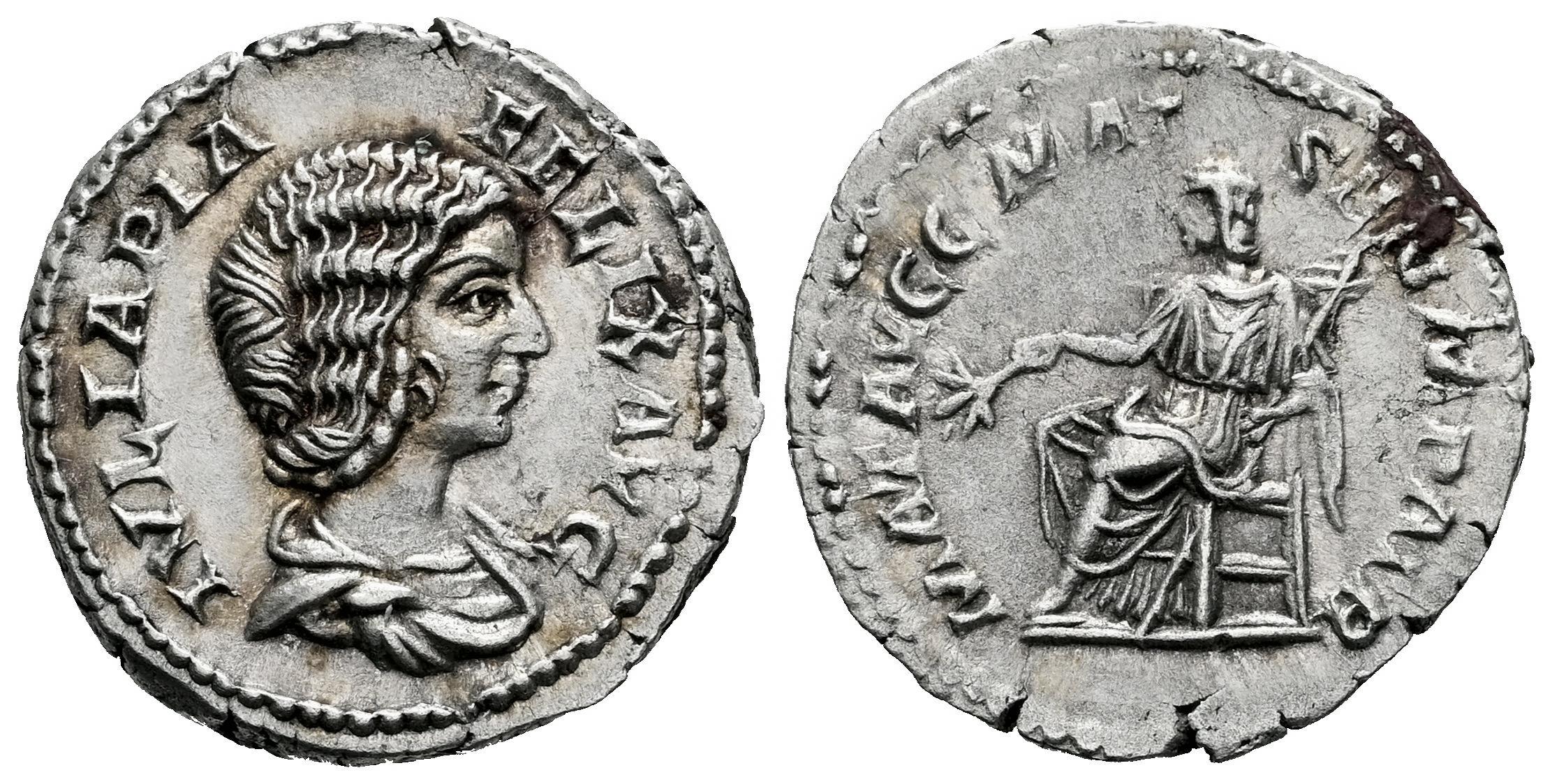 Julia Domna. Denario. 211-217 d.C. Roma. (Ric-381). (Bmcre-12). Anv.: IVLIA PIA FELIX AVG. Busto drapeado a la derecha. Rev.: MAT AVGG MAT SEN M PATR. Julia sedente a la izquierda sosteniendo una rama y un cetro. Ag. 3,12 g. Ligero tono. Leves depósitos en reverso. EBC-/MBC+. Est...120,00.