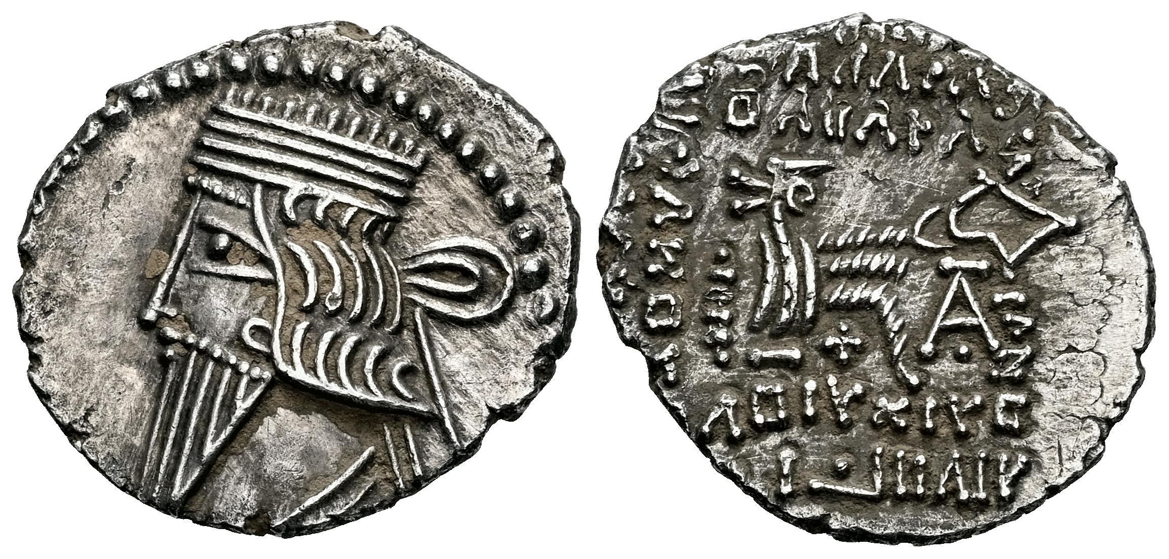 Imperio Parto. Pakoros I. Dracma. 78-120 d.C. Ekbatana. (Sellwood-78.6 (Vologases III)). (Sunrise-78.6). Anv.: Cabeza con diadema a la izquierda, con barba larga. Rev.: Arquero (Arsakes I) sedente a la derecha, con base de trono visible, portnando un arco; monograma debajo del arco. Ag. 3,70 g. EBC. Est...120,00.