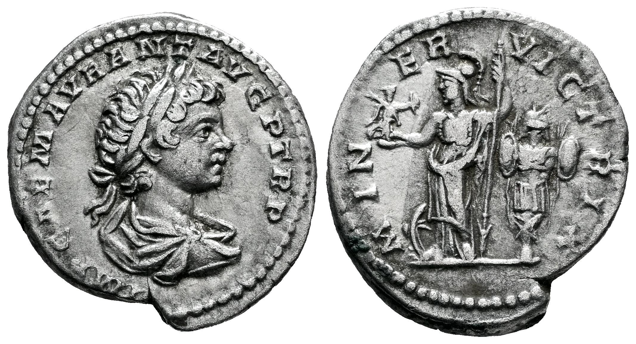 Caracalla. Denario. 198 d.C. Roma. (Ric-IV 25b). (Bmcre-107). (Rsc-159a). Anv.: IMP CAE M AVR ANT AVG P TR P. Busto laureado, drapeado y con coraza a la derecha. Rev.: MINER VICTRIX. Minerva en pie a la izquierda, sosteniendo una Victoria y una lanza; escudo a sus pies, trofeo detrás. Ag. 3,31 g. MBC+/MBC. Est...90,00.