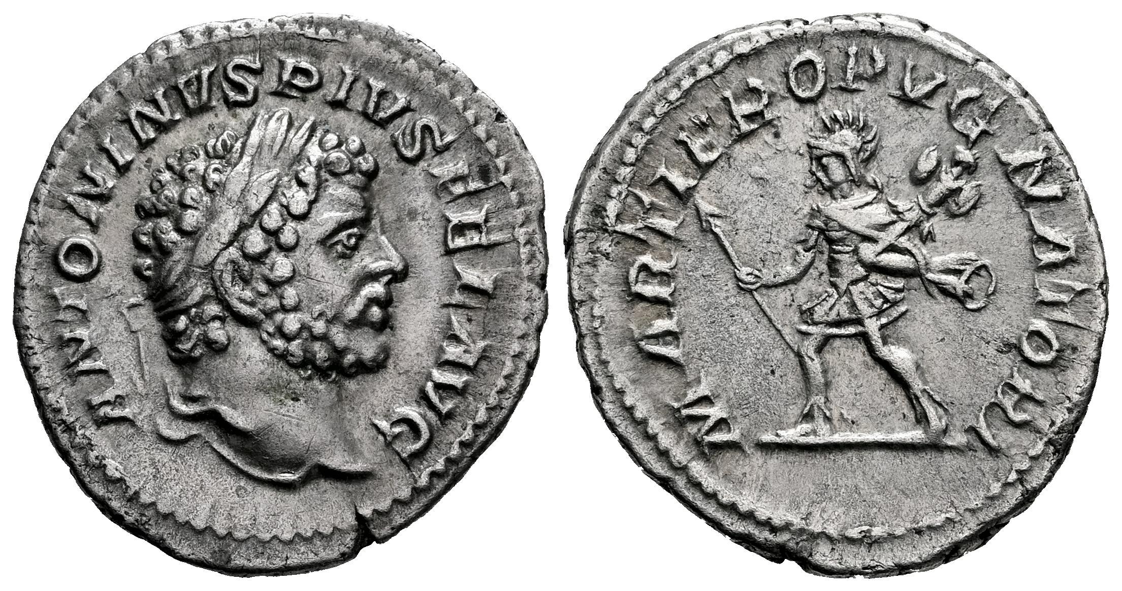 Caracalla. Denario. 213 d.C. Roma. (Ric-IV 235). (Bmcre-60). (Rsc-151). Anv.: ANTONINVS PIVS FEL AVG. Cabeza laureada a la derecha. Rev.: MARTI PROPVGNATORI. Marte avanzando a la izquierda, sosteniendo lanza y trofeo. Ag. 2,90 g. MBC+. Est...100,00.