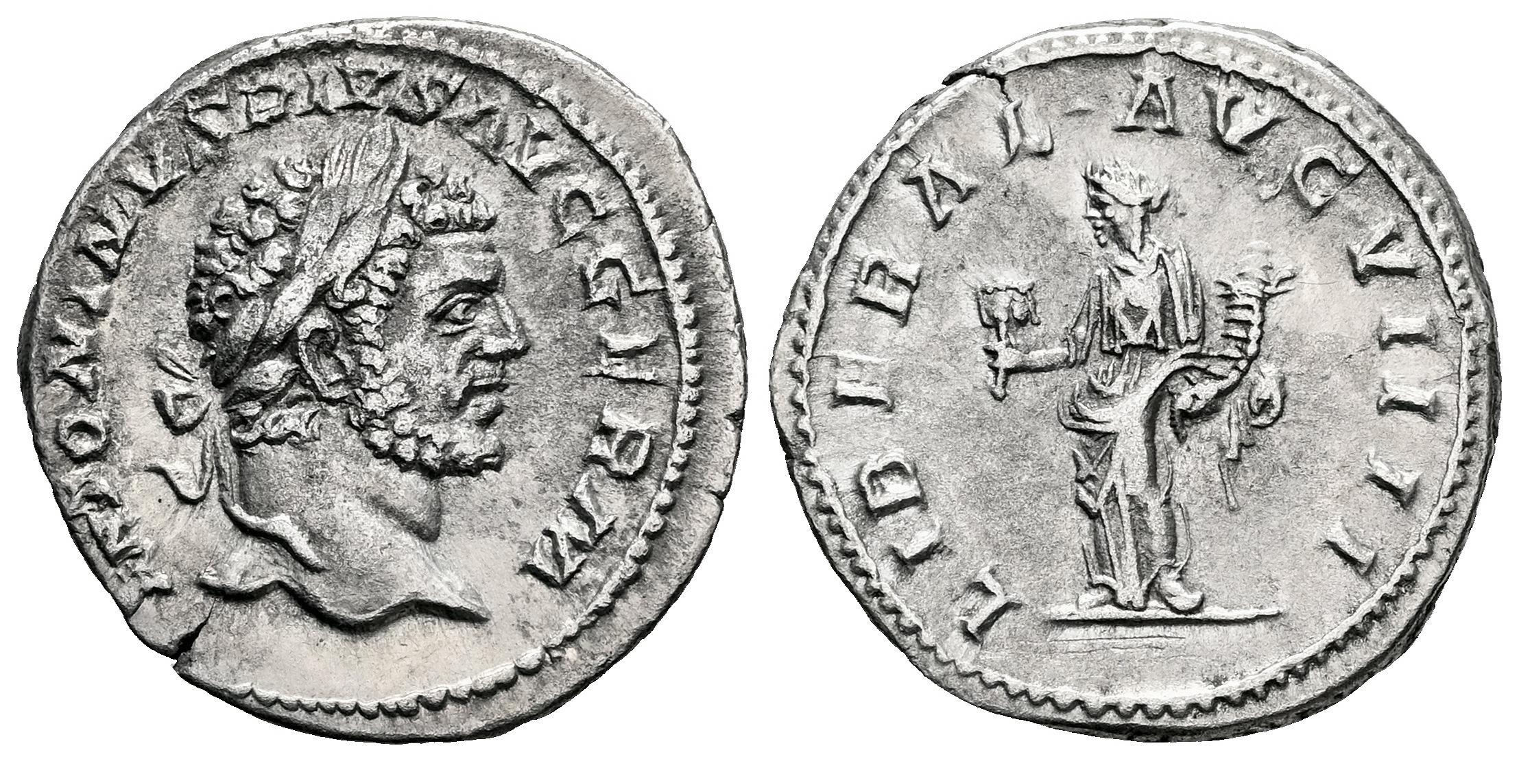 Caracalla. Denario. 213-217 d.C. Roma. (Ric-IV 302 var.). (Bmcre-70 var.). (Rsc-139 var.). Anv.: ANTONINVS PIVS AVG GERM. Cabeza laureada a la derecha. Rev.: LIBERAL·AVG·VIII. Liberalitas en pie a la izquierda, sosteniendo ábaco y cornucopia. Ag. 2,94 g. Ex Tauler & Fau 68 (03/11/2020), lote 1158. MBC+. Est...80,00.