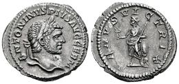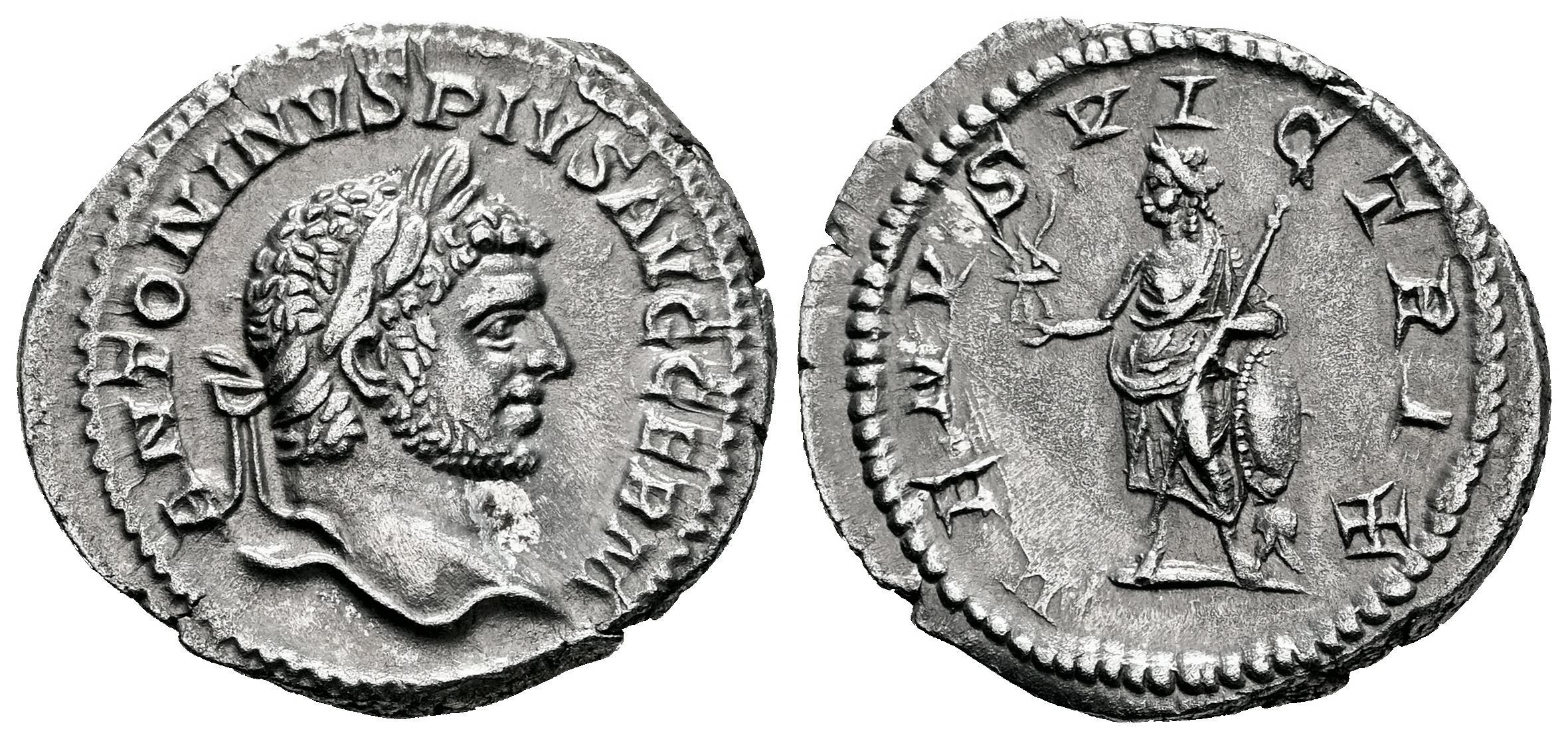 Caracalla. Denario. 213-217 d.C. Roma. (Ric-IV 311b). (Bmc-82). (Rsc-606). Anv.: ANTONINVS PIVS AVG GERM. Cabeza laureada a la derecha. Rev.: VENVS VICTRIX. Venus en pie de frente, mirando a la izquierda, sosteniendo una Victoria y la lanza, apoyada en un escudo colocado sobre un casco. Ag. 3,07 g. Restos de brillo original. EBC-. Est...150,00.