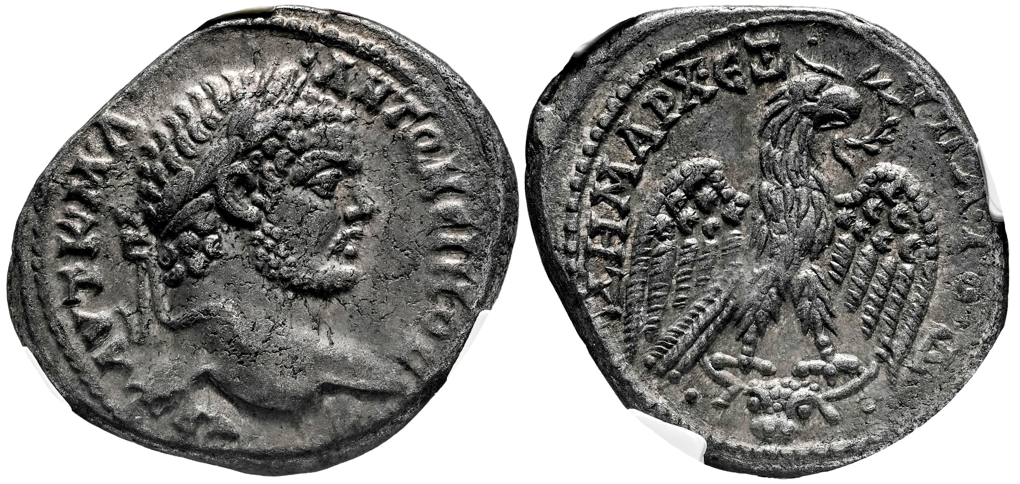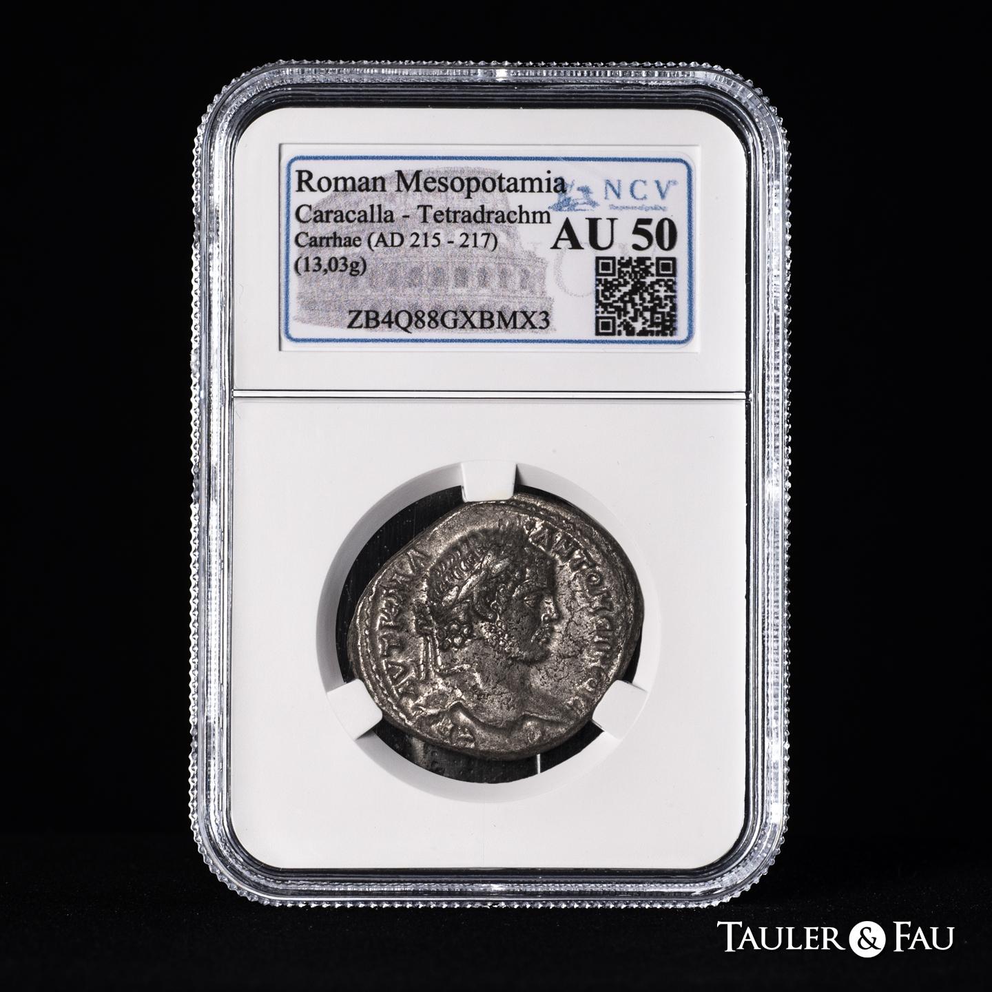 Caracalla. Carrhae. Tetradracma. 215-217 d.C. Mesopotamia. (Prieur-820). Anv.: AVT K•M•A•ANTΩNEINOC CEB. Cabeza radiada a la derecha. Rev.: ΔHMAPX•EΞ•YΠA•TO•Δ. Águila en pie de frente sobre la cabeza de un toro de cuernos largos, cabeza a la derecha, con las alas desplegadas, sosteniendo una corona en el pico. Ag. 13,03 g. Escasa. Encapsulada por NCV como AU 50. NCV-AU. Est...200,00.