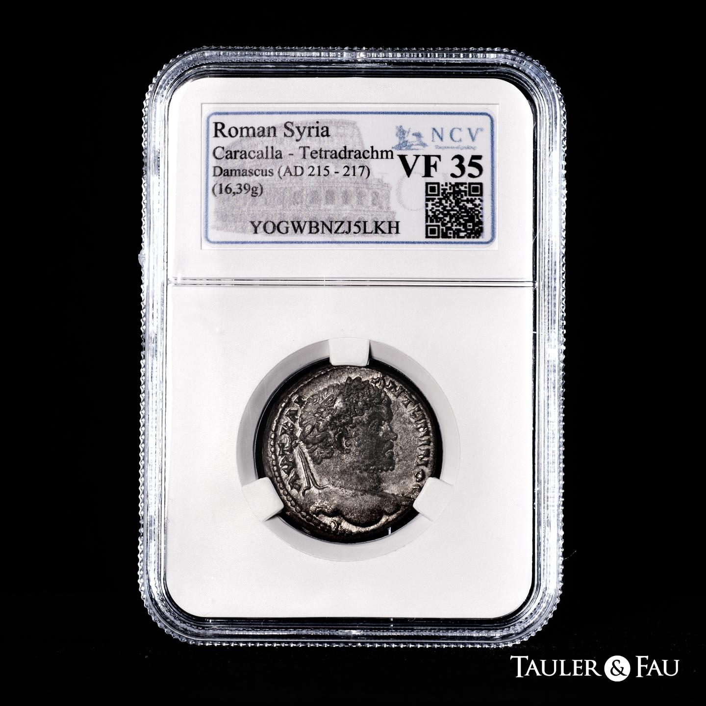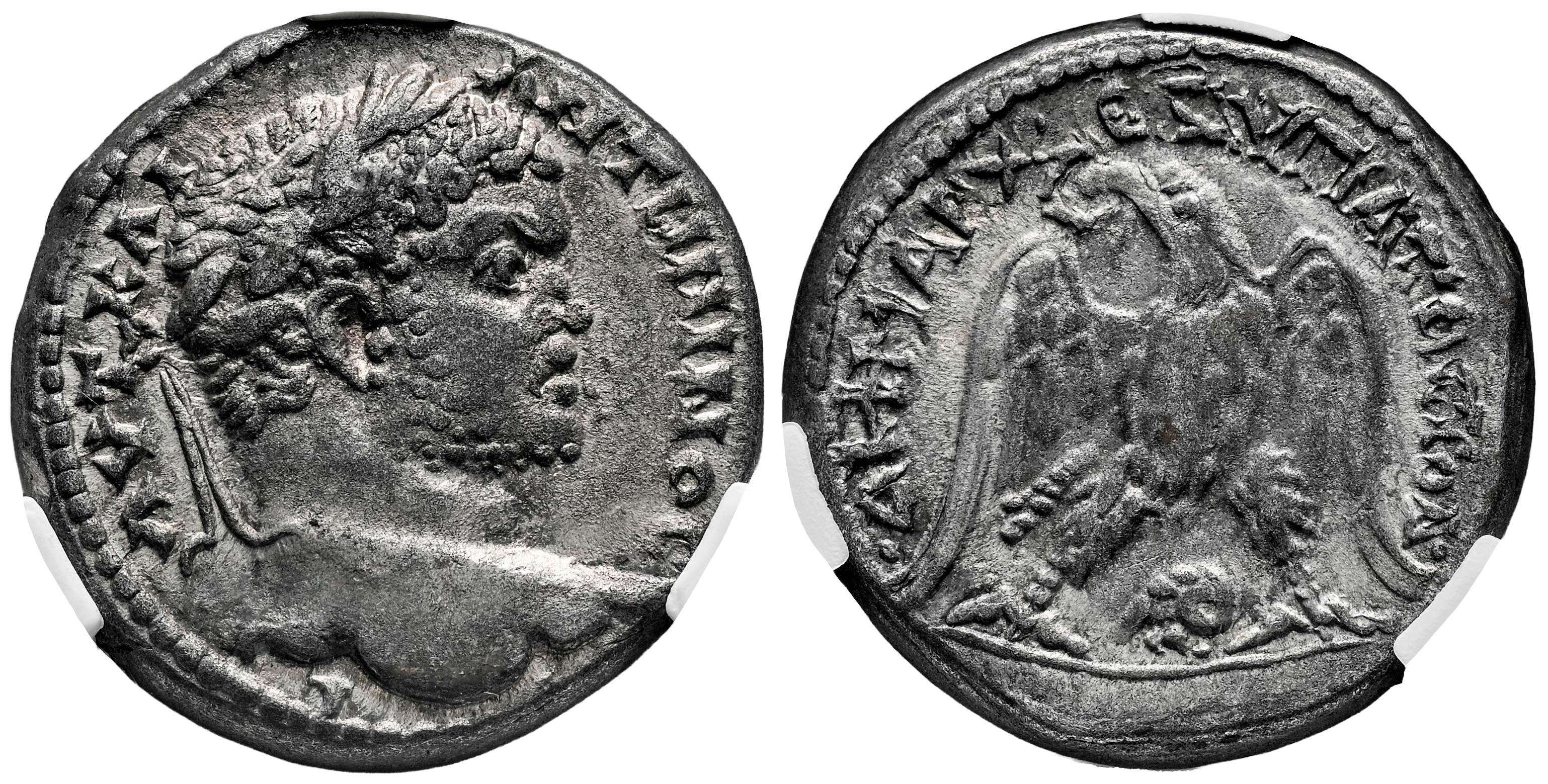Caracalla. Seleucis y Pieria. Tetradracma. 215-217 d.C. Damasco. (Prieur-1206). Anv.: AYT KAI ANTѠNINOC C. Cabeza laureada a la derecha. Rev.: • ΔHMAPX • ΄Ξ VΠATOC TO Δ •. Águila en pie de frente, cabeza y cola hacia la izquierda, con alas extendidas y corona en el pico; cabeza de carnero a la izquierda entre las patas. Ag. 16,39 g. Escasa. Encapsulada por NCV como VF 35. NCV-VF. Est...200,00.