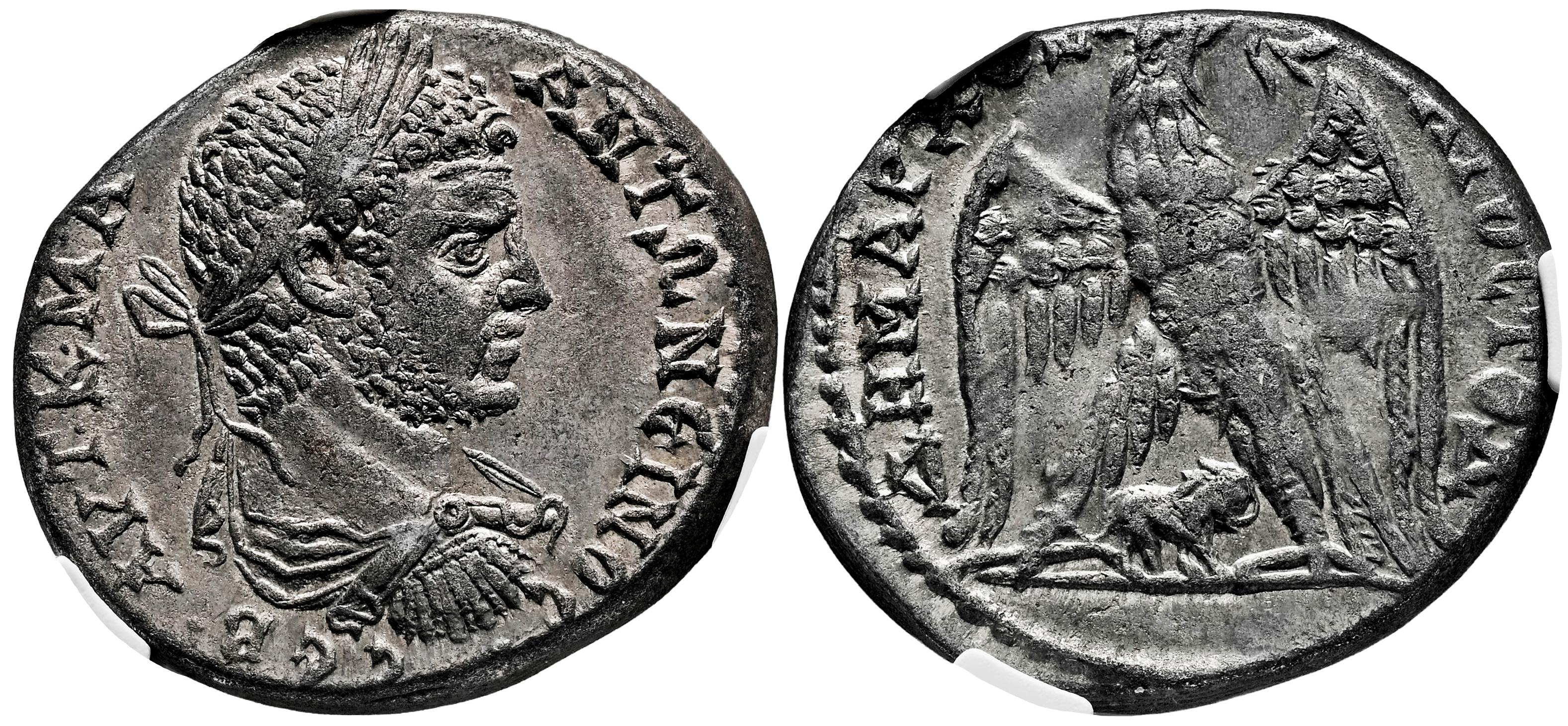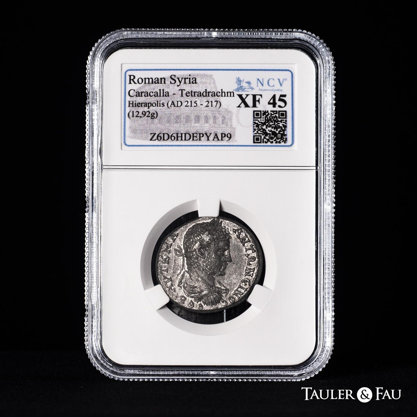 Caracalla. Hierapolis. Tetradracma. 215-217 d.C. Cyrrhestica. (Prieur-929). Anv.: ΑΥΤ·Κ·Μ Α ΑΝΤΩΝЄΙΝΟϹ·ϹЄΒ· . Busto laureado, drapeado y con coraza a la derecha. Rev.: ΔΗΜΑΡΧ ЄΞ ΥΠΑΤΟϹ ΤΟ Δ. Águila en pie de frente, alas extendidas, cabeza a la derecha, corona en pico; león avanzando hacia la derecha entre las patas. Ag. 12,92 g. Precioso y expresivo retrato. Encapsulada por NCV como XF 45. NCV-XF. Est...200,00.