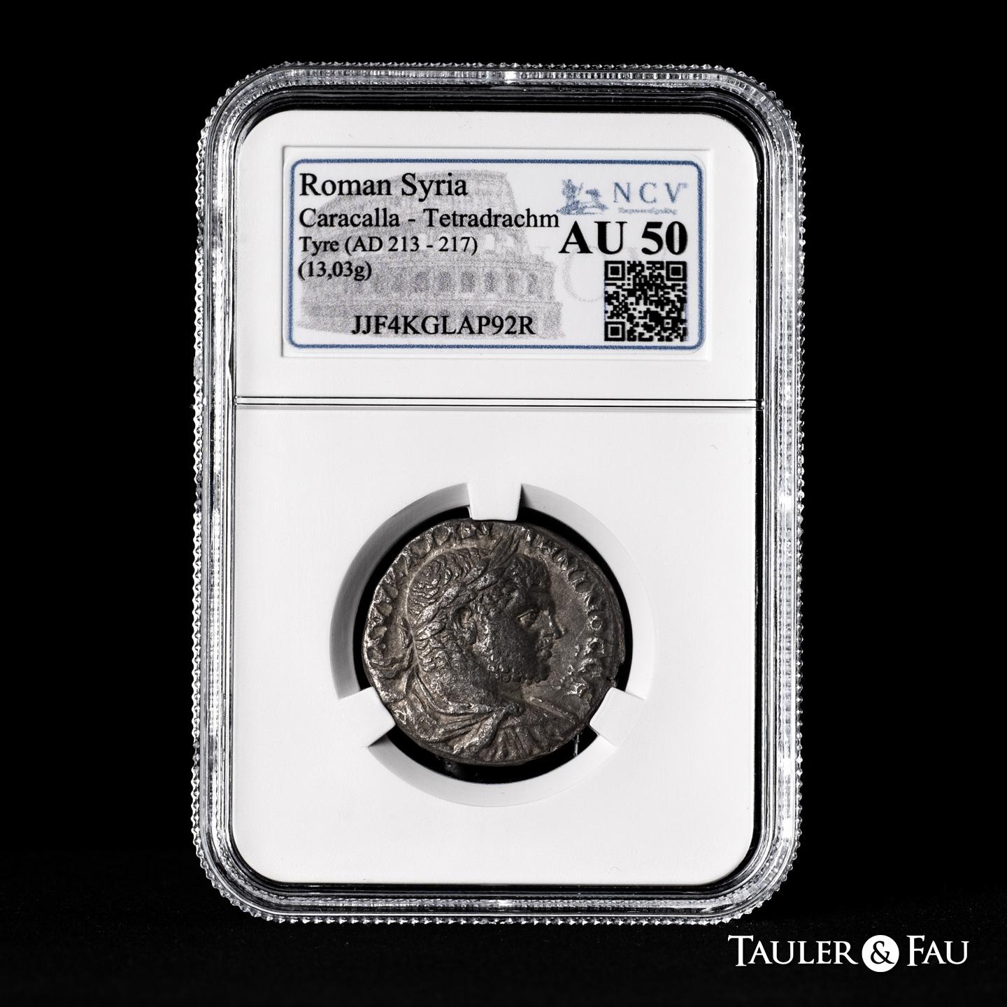 Caracalla. Tiro. Tetradracma. 213-217 d.C. Phoenicia. (Prieur-1551). Anv.: ΑΥΤ ΚΑΙ ΑΝΤѠΝΙΝΟC CЄ. Cabeza laureada a derecha. Rev.: ·ΔΗΜΑΡX·ЄΞ ΥΠΑΤΟC ΤΟ·Δ·. Águila en pie de frente sobre una clava, cabeza a izquierda, con concha de murex entre las patas. Ag. 13,03 g. Suave pátina. Encapsulada por NCV como AU 50. NCV-AU. Est...200,00.