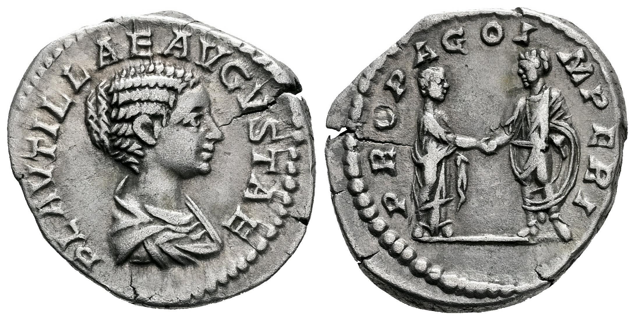 Plautilla. Denario. 202-205 d.C. Roma. (Ric-IV 362). (Bmcre-406). (Rsc-21). Anv.: PLAVTILLAE AVGVSTAE. Busto drapeado a la derecha. Rev.: PROPAGO IMPERI. Emperatriz en pie hacia la derecha a la izquierda, estrechando las manos con Emperador togado de pie hacia la izquierda a la derecha. Ag. 2,95 g. Leve grieta. MBC+/MBC. Est...150,00.