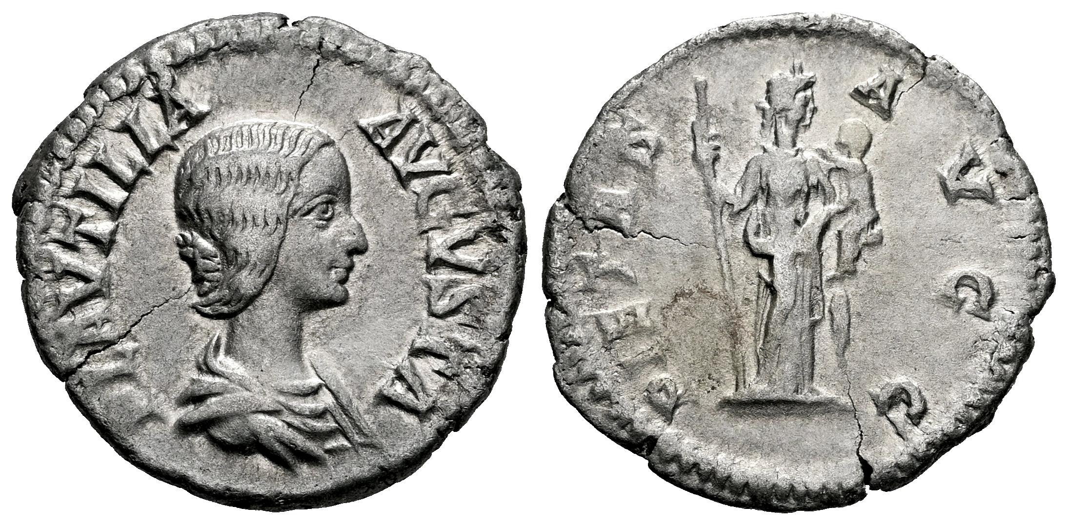 Plautilla. Denario. 202-205 d.C. Roma. (Ric-IV 367). (Bmcre-422). (Rsc-16). Anv.: PLAVTILLA AVGVSTA. Busto drapeado a la derecha. Rev.: PIETAS AVGG. Pietas en pie de frente, mirando hacia la derecha, sosteniendo un cetro y un niño. Ag. 3,04 g. Leve grieta. MBC. Est...100,00.