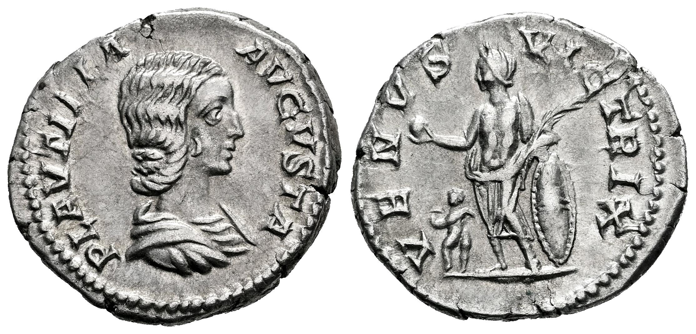 Plautilla. Denario. 202-205 d.C. Roma. (Ric-IV 369). (Bmcre-429). (Rsc-25). Anv.: PLAVTILLA AVGVSTA. Busto drapeado a la derecha. Rev.: VENVS VICTRIX. Venus en pie de frente, mirando hacia la izquierda, sosteniendo una manzana y una palma, apoyando el codo sobre un escudo; Cupido a sus pies a la izquierda. Ag. 3,40 g. Atractiva. EBC-. Est...160,00.