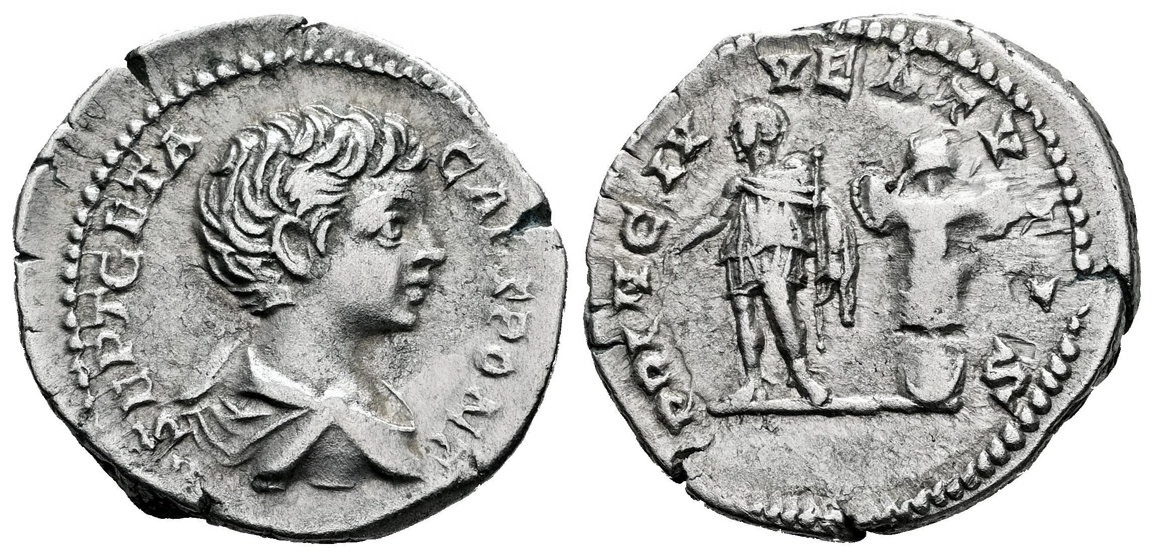 Geta. Denario. 200-202 d.C. Roma. (Ric-IV 18). (Bmcre-234). (Rsc-157b). Anv.: P SEPT GETA CAES PONT. Busto con la cabeza desnuda y drapeado a la derecha. Rev.: PRINC IVVENTVTIS. Príncipe en pie a la izquierda, sosteniendo una rama y una lanza; trofeo detrás. Ag. 3,28 g. MBC+/MBC. Est...90,00.