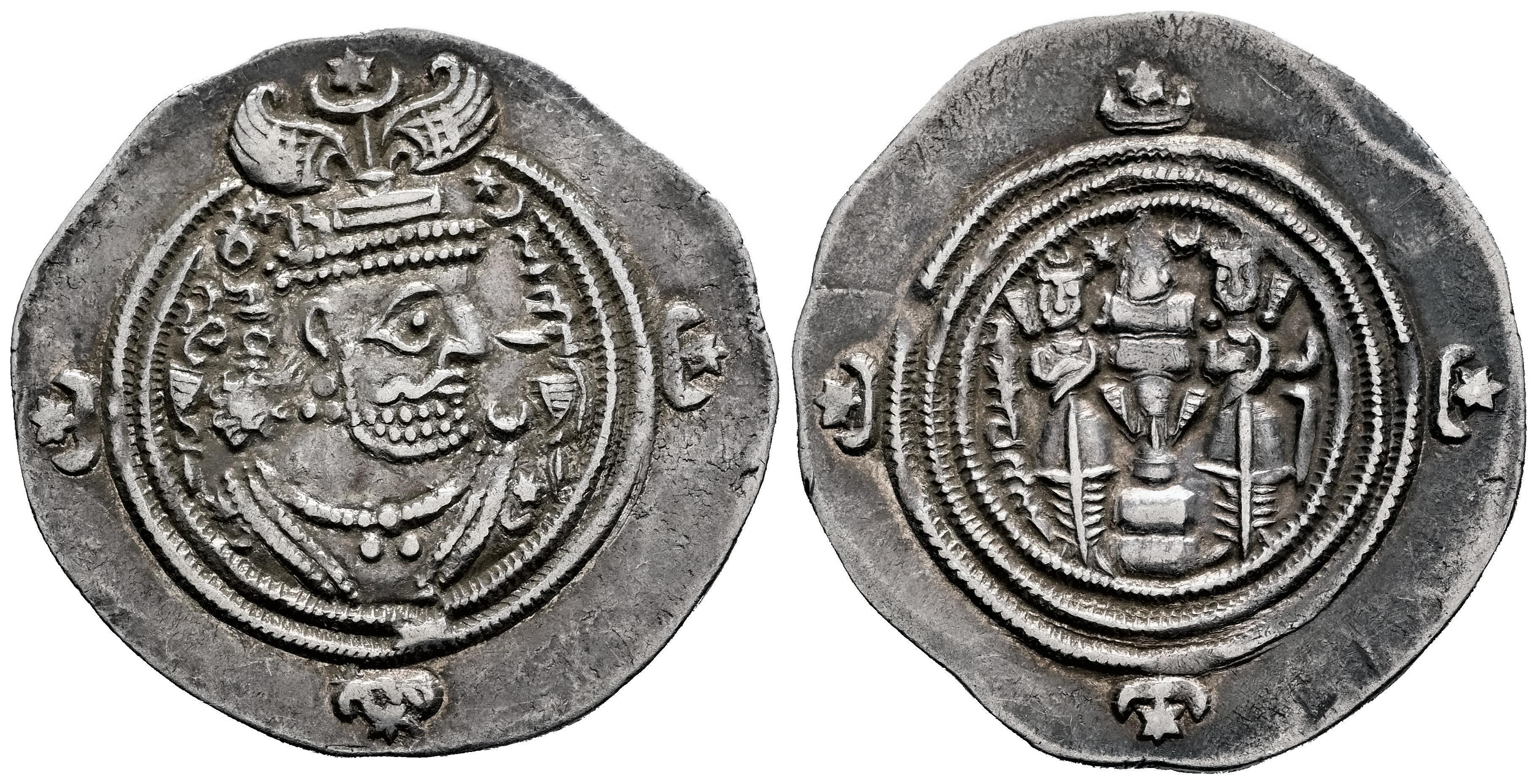 Imperio Sasánida. Khusro II. Dracma. RY 35 = 624/5 d.C. YZ (Yazd). (Göbl-II/3). Anv.: Busto drapeado de Cosroes II a la derecha, con una elaborada corona mural; detrás de la cabeza, AFZUT GDH ('que su reinado vaya en aumento' en pahlawi); delante de la cabeza, HWSRWD ('Cosroes' en pahlawi). Rev.: Altar del fuego con cintas, flanqueado por dos asistentes; en el campo superior izquierdo, una estrella de seis puntas; en el campo superior derecho, una media luna; a la izquierda, la fecha; a la derecha, YZ (nombre de la Casa de la Moneda en pahlawi). Ag. 4,12 g. MBC+. Est...60,00.