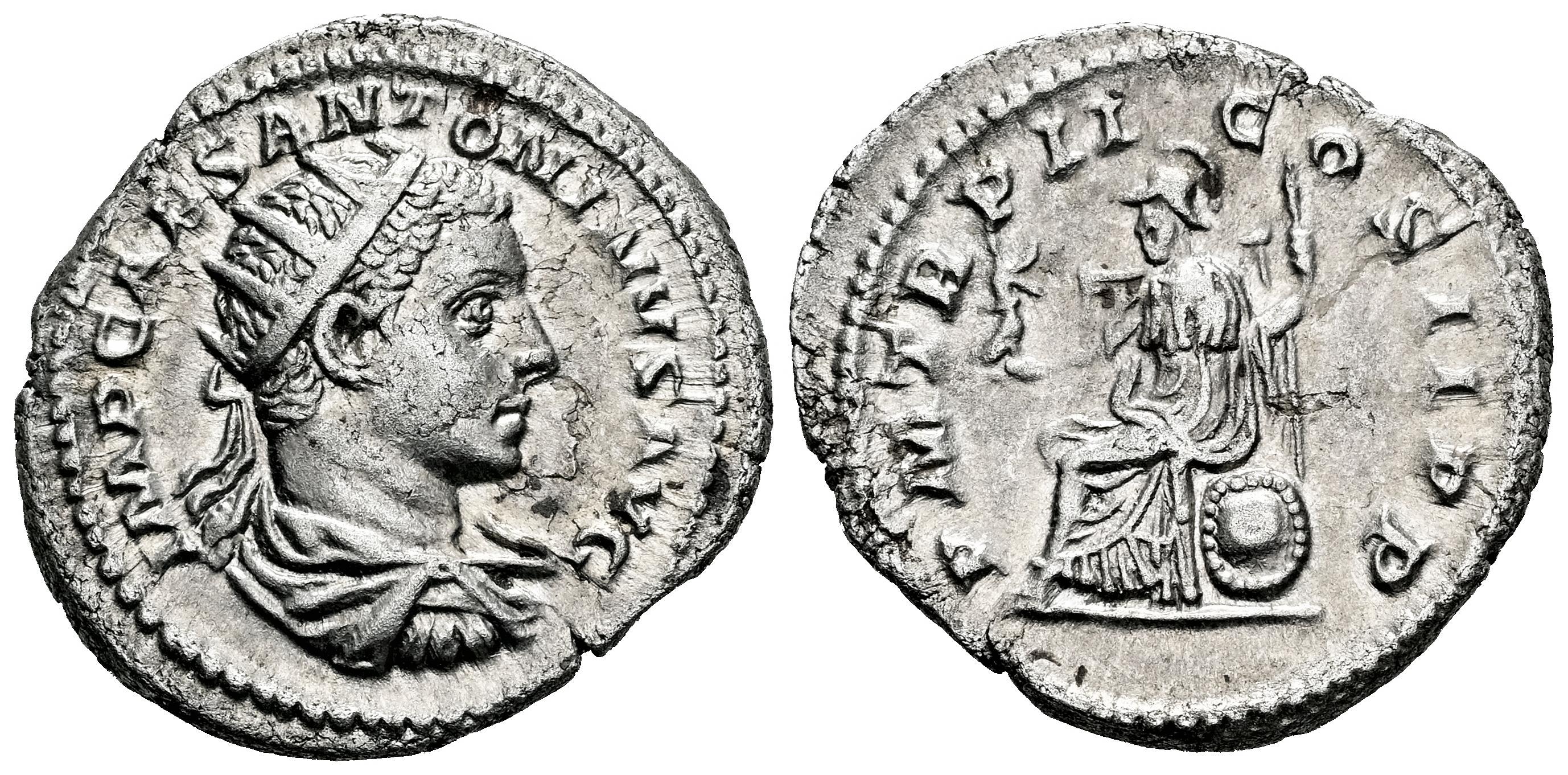 Eliogábalo. Antoniniano. 219 d.C. Roma. (Ric-14). (Bmc-89). (Rsc-141). Anv.: IMP CAES ANTONINVS AVG. Busto radiado y drapeado a la derecha. Rev.: P M TR P II COS II P P. Roma sedente a la izquierda en trono, portando Victoria en la mano derecha y un largo cetro en la izquierda; a su lado, escudo. Ag. 5,64 g. EBC-. Est...150,00.
