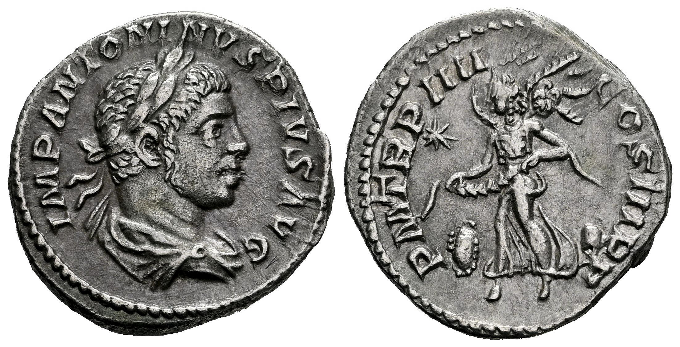 Eliogábalo. Denario. 220-221 d.C. Roma. (Ric-IV 45). (Bmcre-253). (Rsc-194). Anv.: IMP ANTONINVS PIVS AVG. Busto laureado, drapeado y con coraza a la derecha. Rev.: P M TR P IIII COS III P P. Victoria volando a la izquierda, sosteniendo una corona abierta, un pequeño escudo a izquierda y derecha; estrella en el campo izquierdo. Ag. 2,92 g. MBC+. Est...100,00.