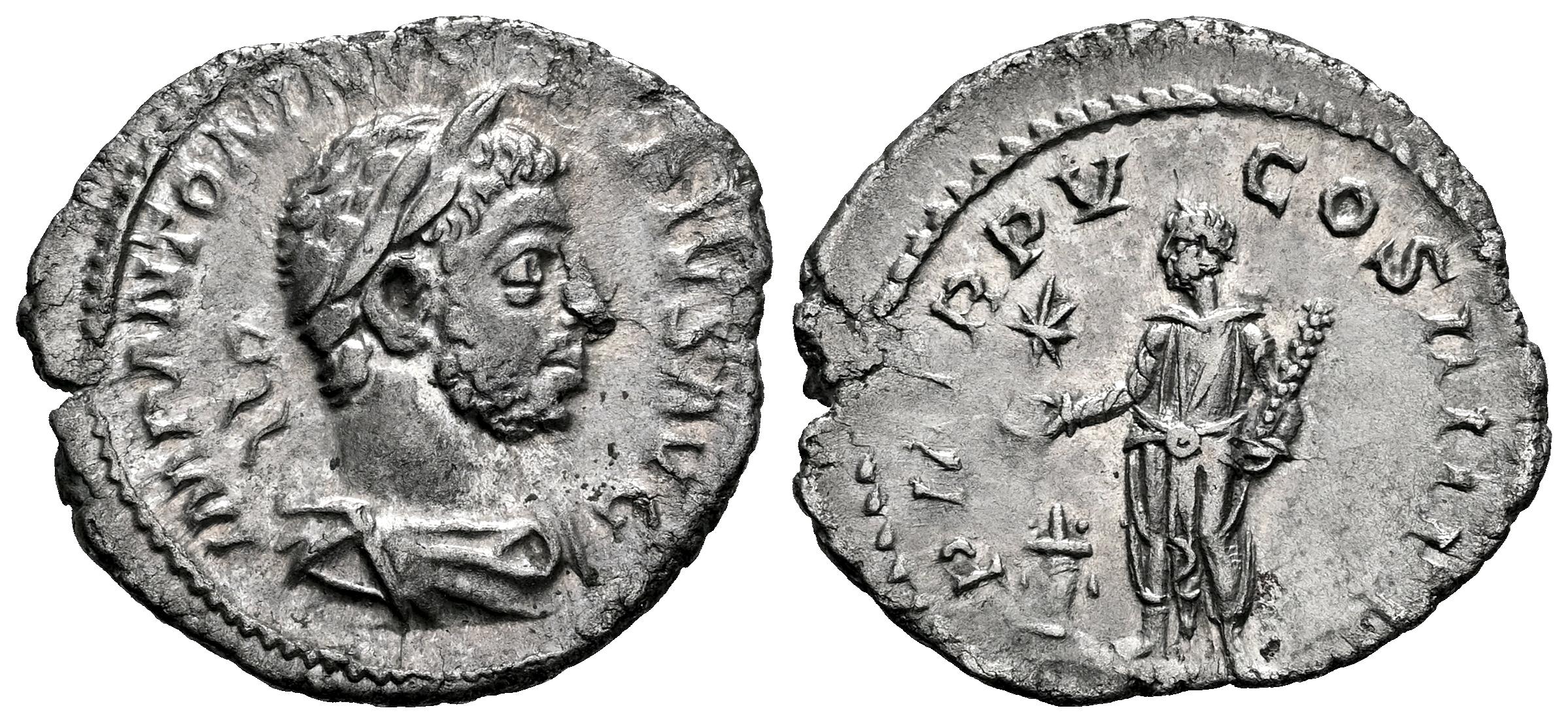 Eliogábalo. Denario. 222 d.C. Roma. (Ric-IV 52). (Bmcre-269). (Rsc-213c). Anv.: IMP ANTONINVS PIVS AVG. Busto laureado y drapeado a la derecha, llevando 'cuerno'. Rev.: P M TR P V COS IIII P P. Emperador en pie a la izquierda, sacrificando con una patera sobre un altar en llamas y sosteniendo un garrote; estrella en el campo izquierdo. Ag. 2,52 g. Restos de brillo original. MBC+. Est...100,00.