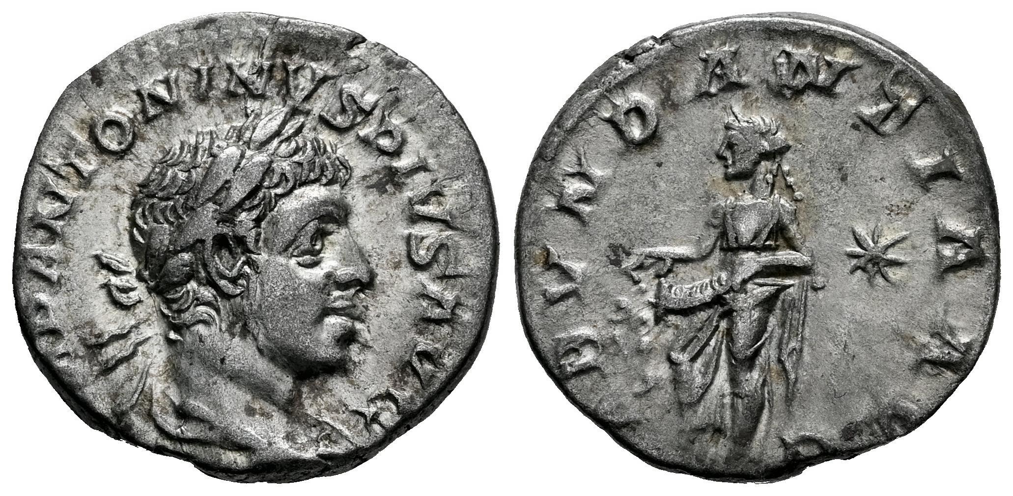 Eliogábalo. Denario. 220-222 d.C. Roma. (Ric-IV 56). (Bmcre-189/91). (Rsc-1a). Anv.: IMP ANTONINVS PIVS AVG. Busto laureado y drapeado a la derecha. Rev.: ABVNDANTIA AVG. Abundantia en pie de frente, mirando hacia la izquierda, vaciando cornucopia; estrella en el campo derecho. Ag. 2,71 g. MBC+. Est...80,00.