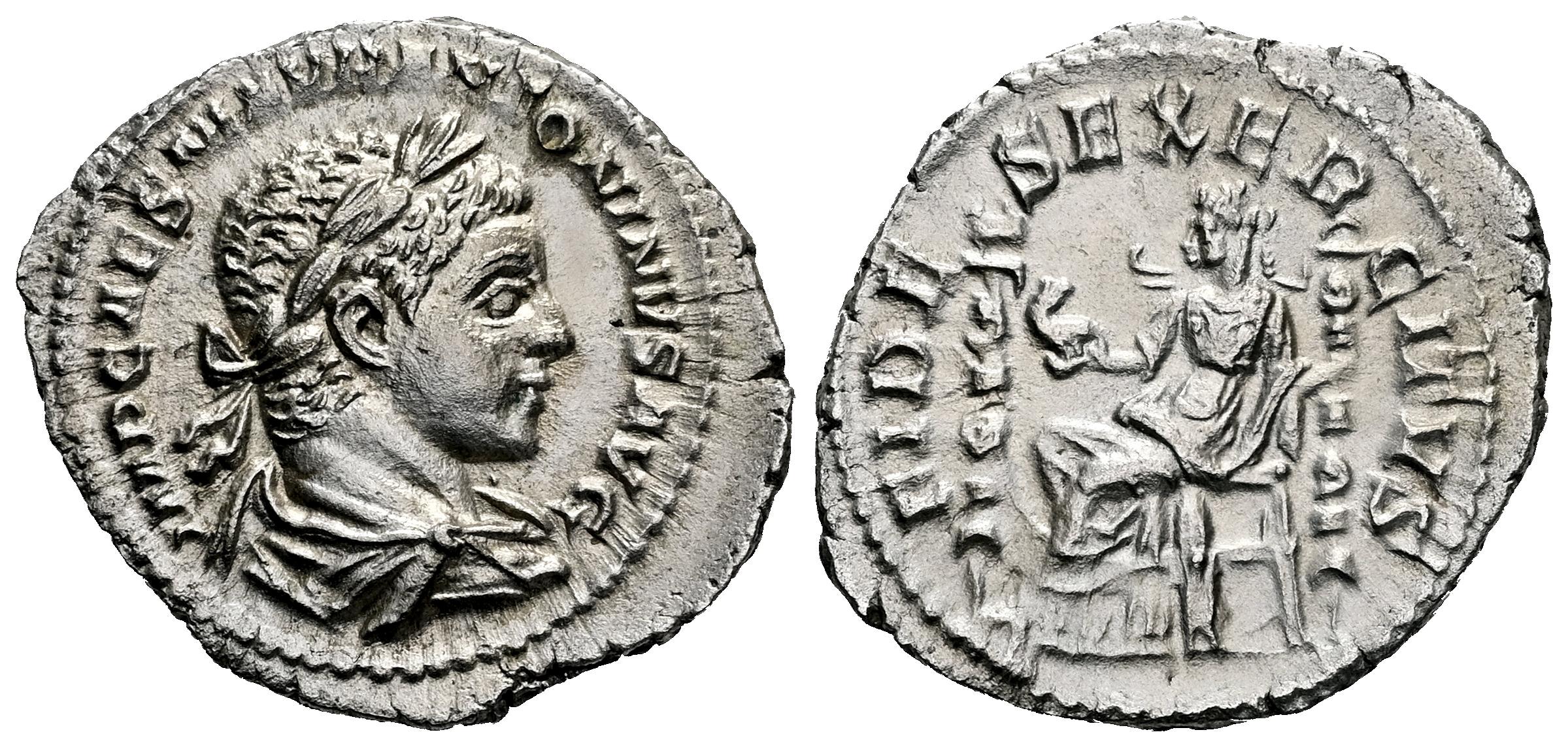 Eliogábalo. Denario. 218 d.C. Roma. (Ric-IV 71). (Bmcre-15). (Rsc-32a). Anv.: IMP CAES M AVR ANTONINVS AVG. Busto laureado y drapeado a la derecha. Rev.: FIDES EXERCITVS. Fides sedente a la izquierda, sosteniendo un águila y estandarte, otro estandarte al frente. Ag. 2,93 g. EBC. Est...150,00.
