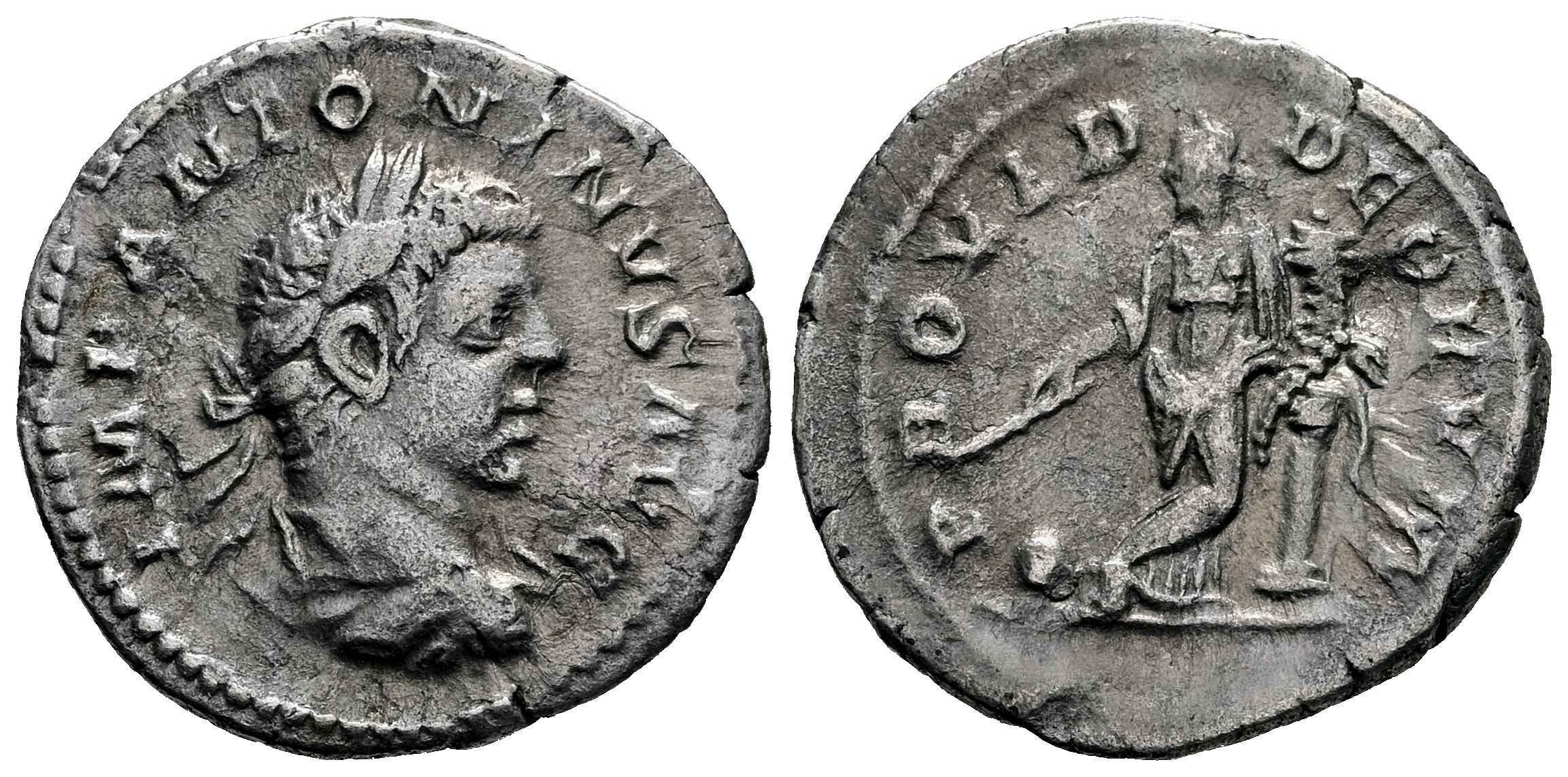 Eliogábalo. Denario. 218-222 d.C. Roma. (Ric-IV 130). (Bmcre-158). (Rsc-244). Anv.: IMP ANTONINVS AVG. Busto laureado y drapeado a la derecha. Rev.: PROVID DEORVM. Providentia en pie de frente, mirando hacia la izquierda, sosteniendo vara y cornucopias , apoyada sobre una columna, globo a los pies. Ag. 3,03 g. MBC-/MBC. Est...60,00.