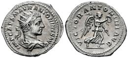 Eliogábalo. Antoniniano. 218-219 d.C. Roma. (Ric-IV 155). (Bmcre-32). (Rsc-291). Anv.: IMP CAES M AVR ANTONINVS AVG. Busto radiado, drapeado y con coraza a la derecha. Rev.: VICTOR ANTONINI AVG. Victoria avanzando a la derecha, sosteniendo corona y palma . Ag. 5,07 g. EBC-. Est...150,00.