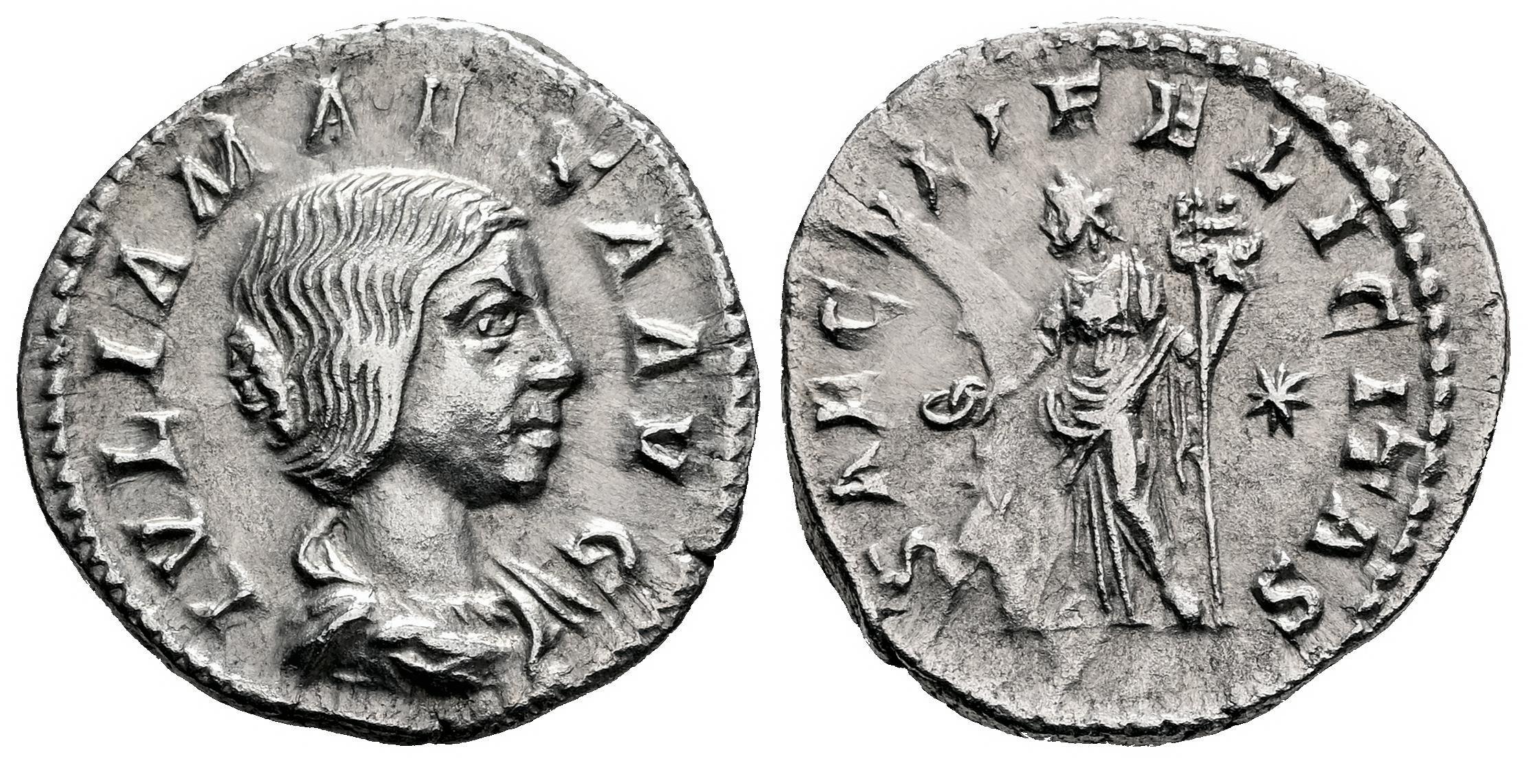 Julia Maesa. Denario. 218-222 d.C. Roma. (Ric-IV 272). (Bmcre-81). (Rsc-45). Anv.: IVLIA MAESA AVG. Busto drapeado a la derecha. Rev.: SAECVLI FELICITAS. Felicitas en pie de frente, mirando a la izquierda, sosteniendo un caduceo y sacrificando sobre un altar iluminado; estrella en el campo izquierdo. Ag. 3,01 g.  Anverso parcialmente incuso en el reverso. EBC-. Est...90,00.