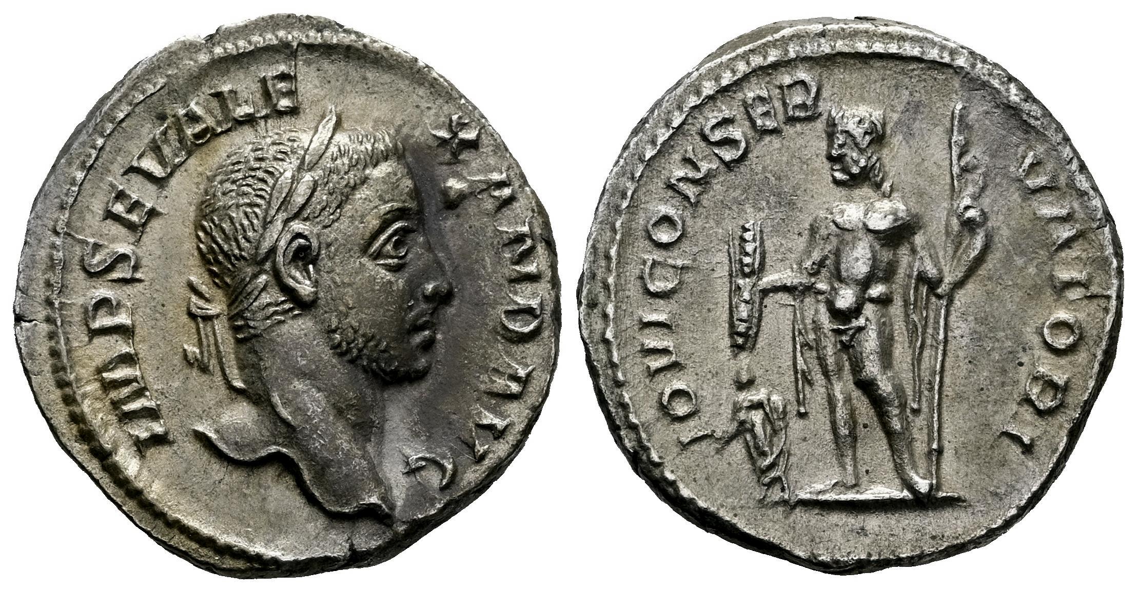 Alejandro Severo. Denario. 228-231 d.C. Roma. (Ric-IV 200). (Bmcre-691). (Rsc-73). Anv.: IMP SEV ALEXAND AVG. Cabeza laureada a la derecha, ligero drapeado en el hombro más alejado. Rev.: IOVI CONSERVATORI. Júpiter en pie a la izquierda, sosteniendo un rayo sobre el emperador y un cetro. Ag. 3,27 g. EBC/EBC-. Est...150,00.