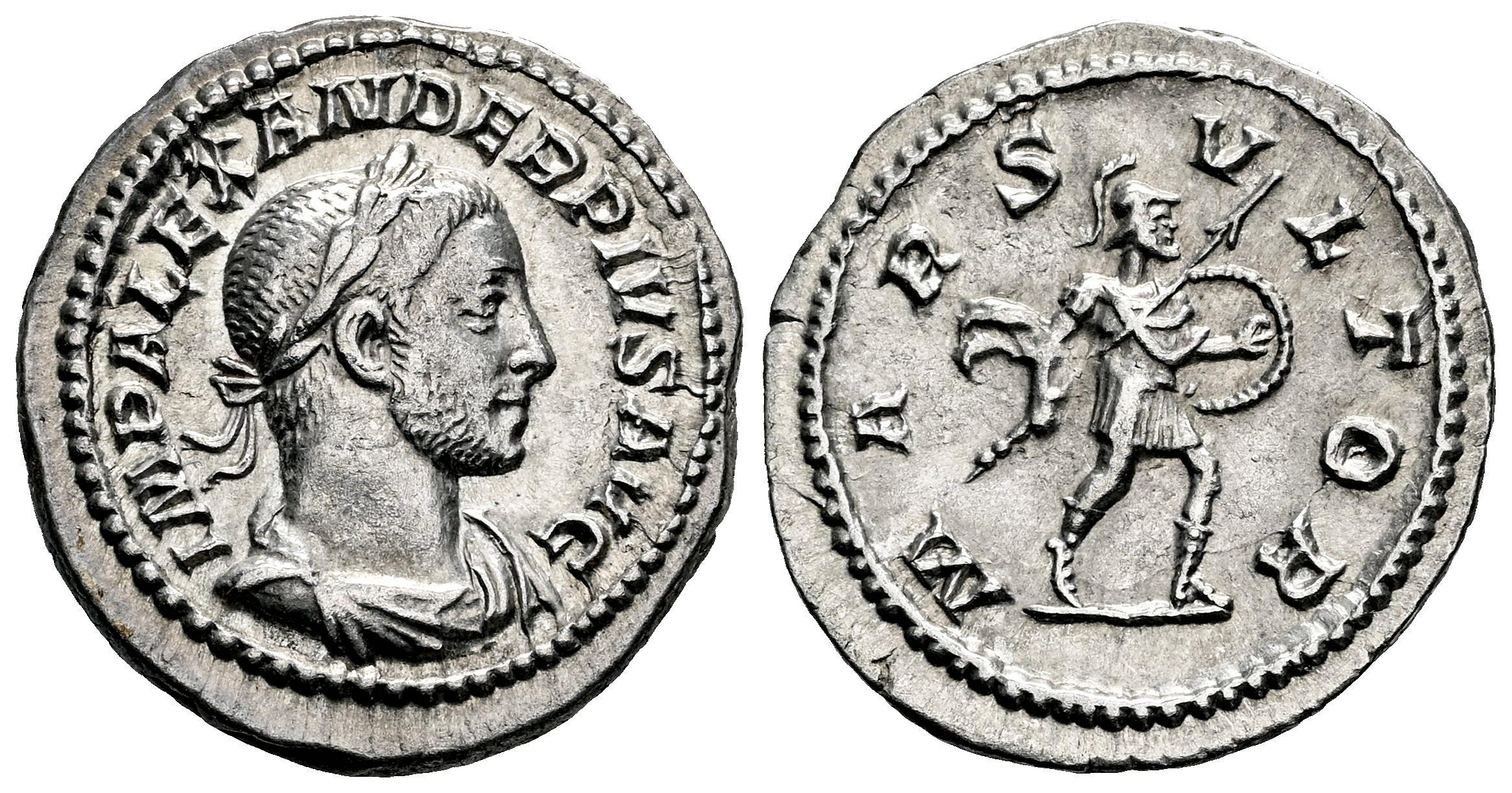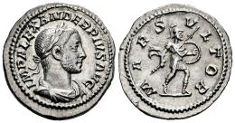 Alejandro Severo. Denario. 232 d.C. Roma. (Ric-IV 246). (Bmcre-831). (Rsc-161a). Anv.: IMP ALEXANDER PIVS AVG. Busto laureado, drapeado y coraza a la derecha. Rev.: MARS VLTOR. Marte avanzando a la derecha, sosteniendo lanza y escudo. Ag. 3,40 g. Ex Áureo & Calicó 350 (02/07/2020), lote 320. EBC-/EBC. Est...150,00.