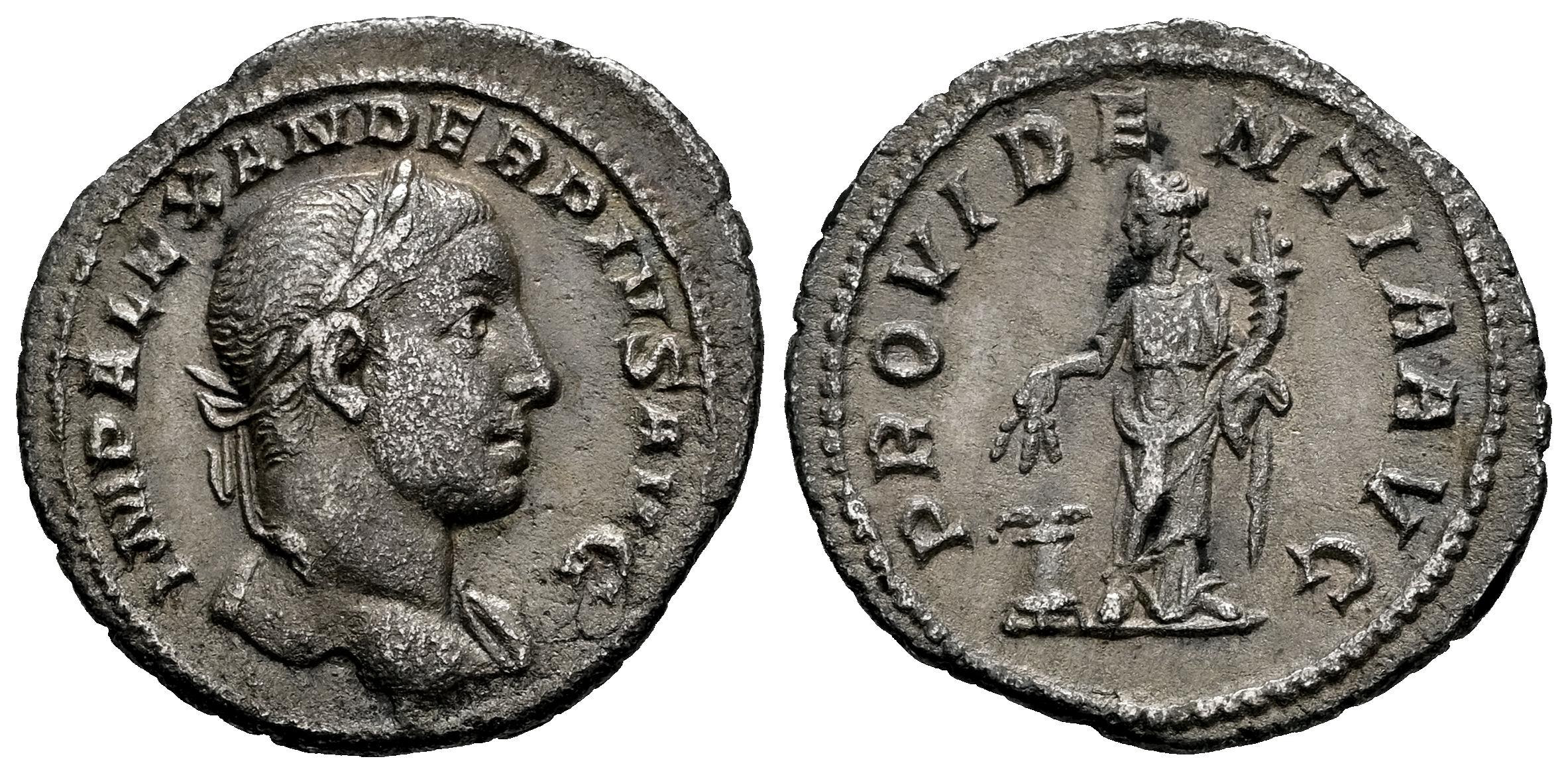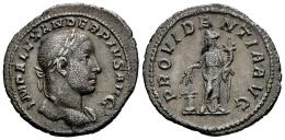 Alejandro Severo. Denario. 232 d.C. Roma. (Ric-IV 250). (Bmcre-875). (Rsc-501b). Anv.: IMP ALEXANDER PIVS AVG. Busto laureado a la derecha, ligero drapeado en el hombro más alejado. Rev.: PROVIDENTIA AVG. Providentia en pie de frente, mirando hacia la izquierda, sosteniendo espigas sobre modio y cornucopia. Ag. 2,78 g. Suave pátina. MBC+. Est...120,00.