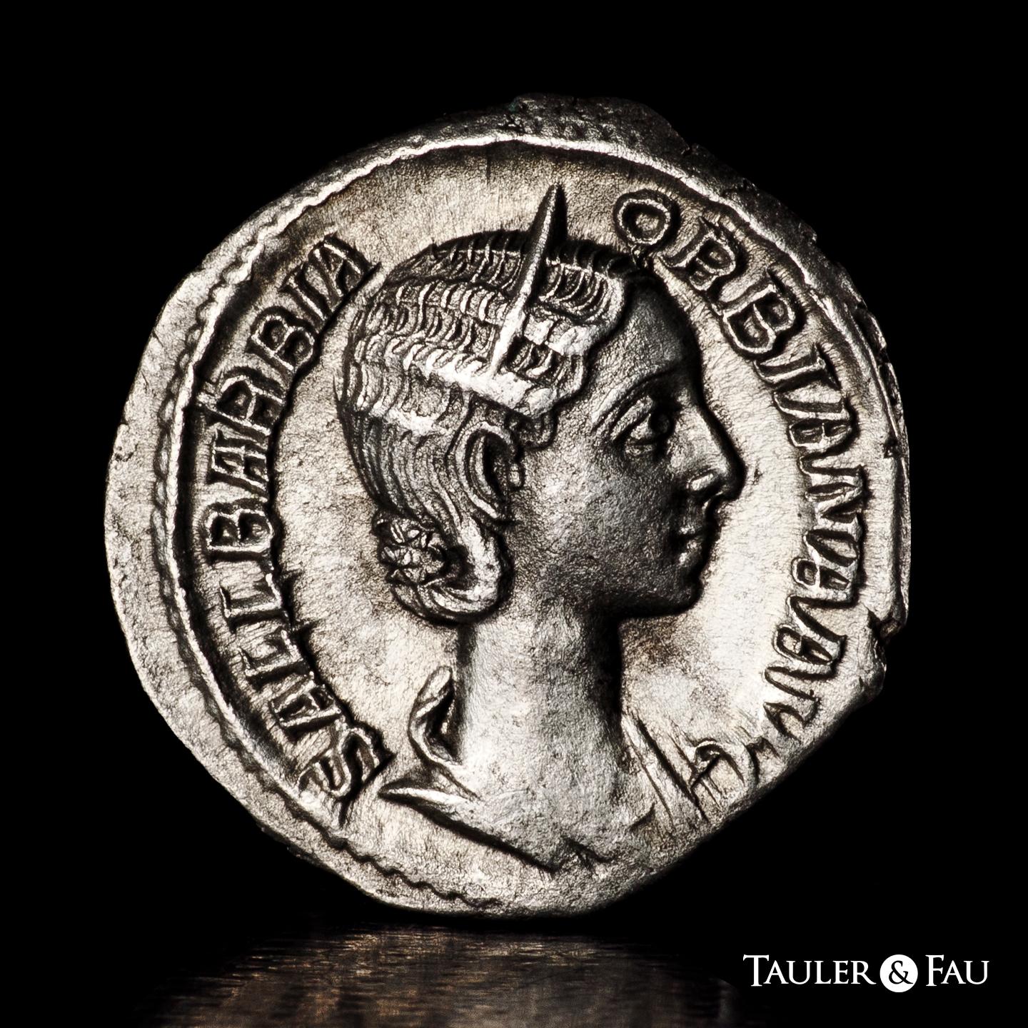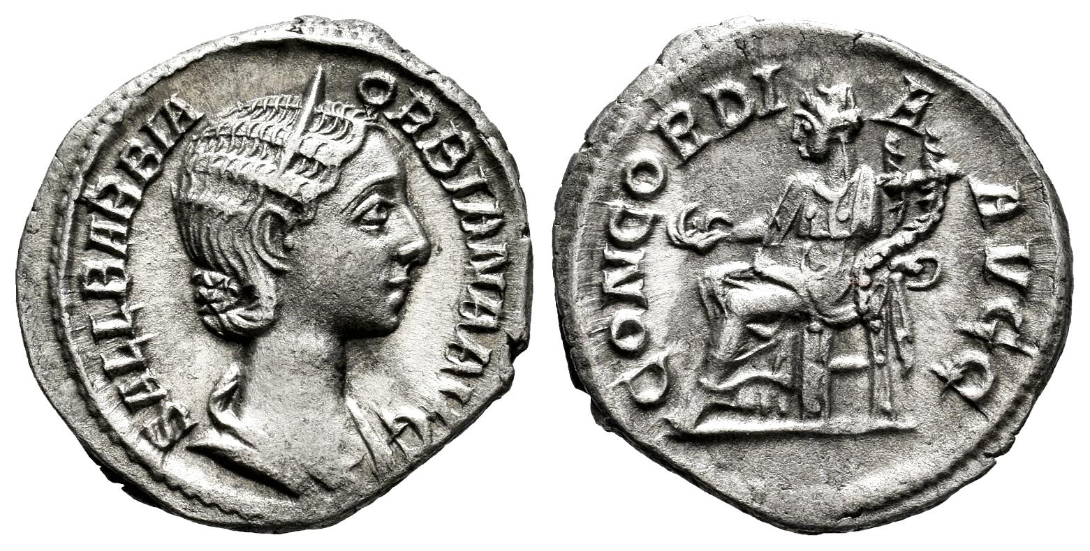 Orbiana. Denario. 225-227 d.C. Roma. (Ric-IV 319). (Bmcre-287). (Rsc-1). Anv.: SALL BARBIA ORIBANA AVG. Busto drapeado a la derecha, vistiendo stephane. Rev.: CONCORDIA AVGG. Concordia sedente a la izquierda, sosteniendo pátera y cornucopia doble. Ag. 2,35 g. Escasa, aún más en esta conservación. EBC. Est...700,00.