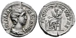 Julia Mamaea. Denario. 222-235 d.C. Roma. (Ric-IV 332). (Bmcre-913). (Rsc-6). Anv.: IVLIA MAMAEA AVG. Busto drapeado a la derecha, con diadema. Rev.: FECVND AVGVSTAE. Fecunditas sedente a la izquierda, sosteniendo la mano de un niño y apoyando el brazo izquierdo sobre un asiento. Ag. 3,28 g. Buen ejemplar con un bonito reverso. Restos de brillo original. EBC/EBC+. Est...200,00.