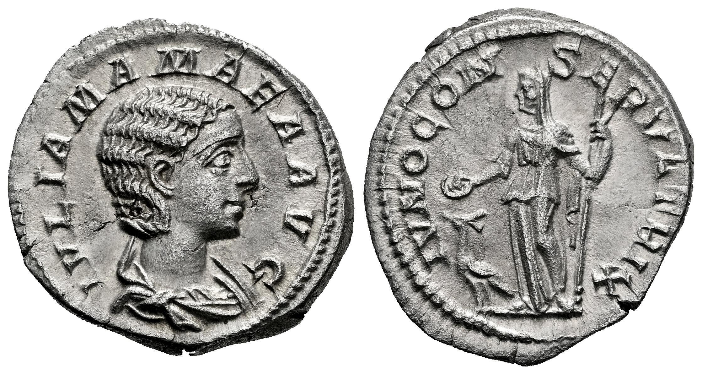 Julia Mamea. Denario. 222-235 d.C. Roma. (Ric-IV 343). (Bmcre-43). (Rsc-35). Anv.: IVLIA MAMAEA AVG. Busto drapeado a la derecha. Rev.: IVNO CONSERVATRIX. Juno en pie a la izquierda, sosteniendo pátera y cetro; pavo real a sus pies a la izquierda. Ag. 2,96 g. Pequeñas grietas en anverso. Bella. EBC. Est...150,00.