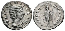 Julia Mamaea. Denario. 222-235 d.C. Roma. (Ric-IV 343). (Bmcre-43). (Rsc-35). Anv.: IVLIA MAMAEA AVG. Busto drapeado a la derecha. Rev.: IVNO CONSERVATRIX. Juno en pie a la izquierda, sosteniendo pátera y cetro; pavo real a sus pies a la izquierda. Ag. 2,58 g. Ligero tono. MBC+/MBC. Est...90,00.