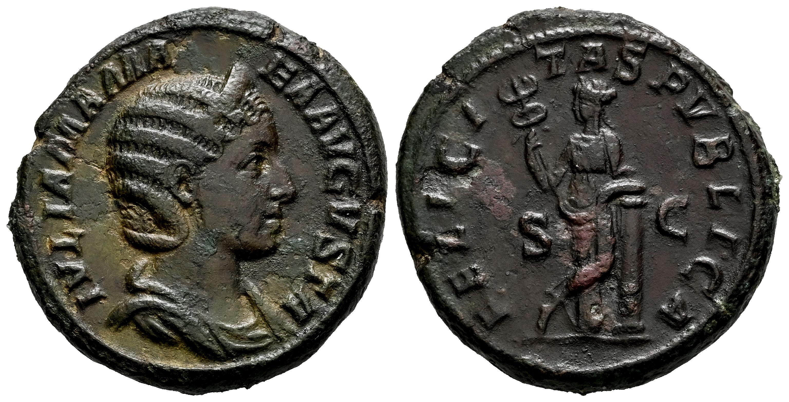 Julia Mamaea. Dupondio. 228 d.C. Roma. (Ric-IV 678). (Bmcre-493). (C-23). Anv.: IVLIA MAMAEA AVGVSTA. Busto diademado y drapeado a la derecha. Rev.: FELICITAS PVBLICA. Felicitas en pie de frente, mirando a la izquierda, con las piernas cruzadas, sosteniendo caduceo y apoyada sobre columna; S-C a través de los campos. Ae. 10,84 g. Escasa. MBC+. Est...120,00.