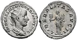 Gordiano III. Antoniniano. 240 d.C. Roma. (Ric-IV 36). (Rsc-130). Anv.: IMP CAES M ANT GORDIANVS AVG. Busto radiado, drapeado y con coraza a la derecha. Rev.: LIBERALITAS AVG II. Liberalitas en pie de frente, mirando hacia la izquierda, sosteniendo ábaco y cornucopia. Ag. 3,74 g. Ligero tono. EBC-. Est...80,00.