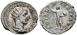 Gordiano III. Antoniniano. 241-243 d.C. Roma. (Ric-IV 83). (Rsc-41). Anv.: IMP GORDIANVS PIVS FEL AVG. Busto radiado, drapeado y con coraza a la derecha. Rev.: AETERNITATI AVG. Sol en pie a la izquierda, levantando la mano y sosteniendo el globo. Ag. 4,42 g. EBC-/MBC+. Est...50,00.
