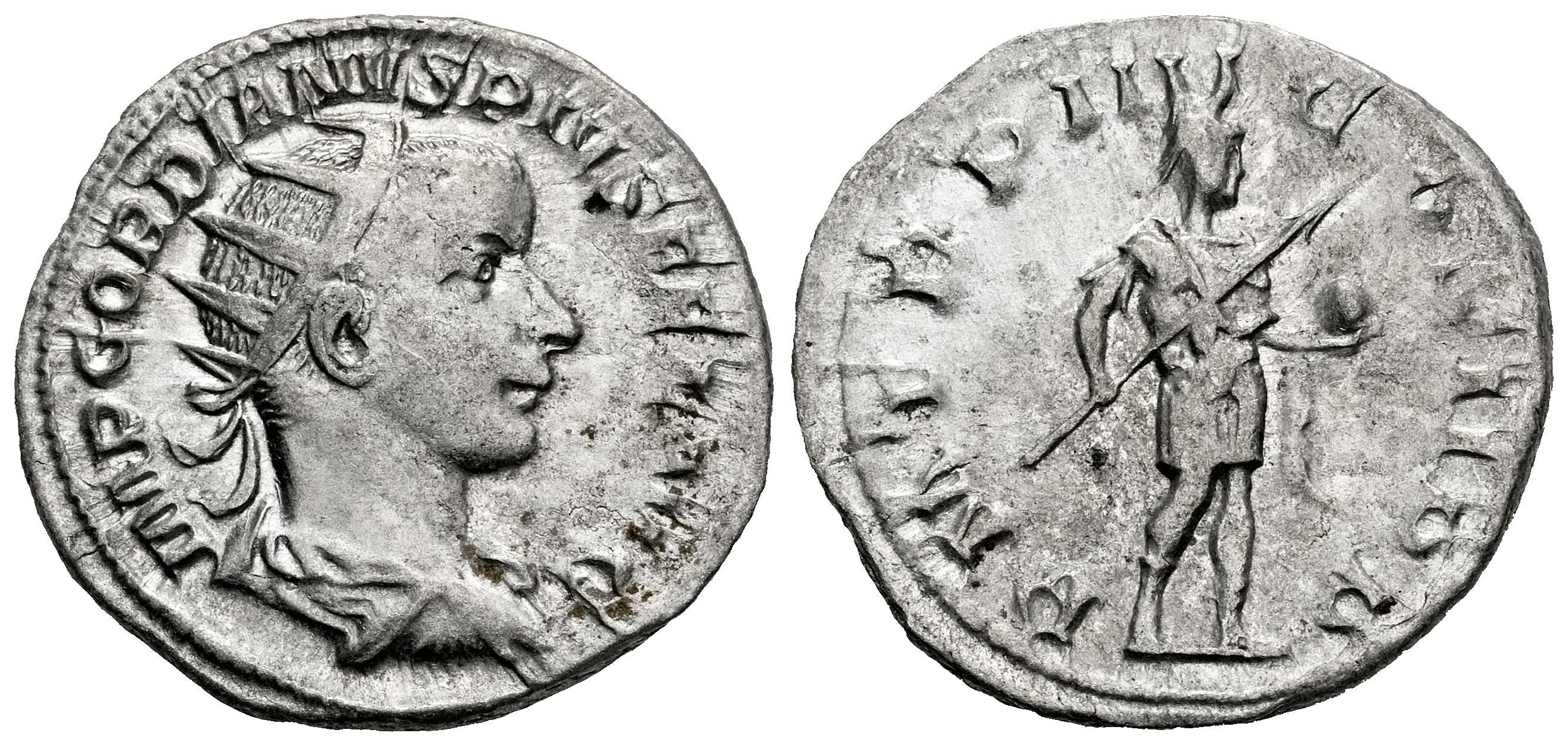 Gordiano III. Antoniniano. 241-243 d.C. Roma. (Ric-IV 91). Anv.: IMP GORDIANVS PIVS FEL AVG. Busto radiado, drapeado y con coraza a la derecha. Rev.: P M TR P III COS II P P. Emperador en pie de frente, mirando a la derecha, portando lanza transversal y globo. Ag. 4,18 g. MBC. Est...60,00.