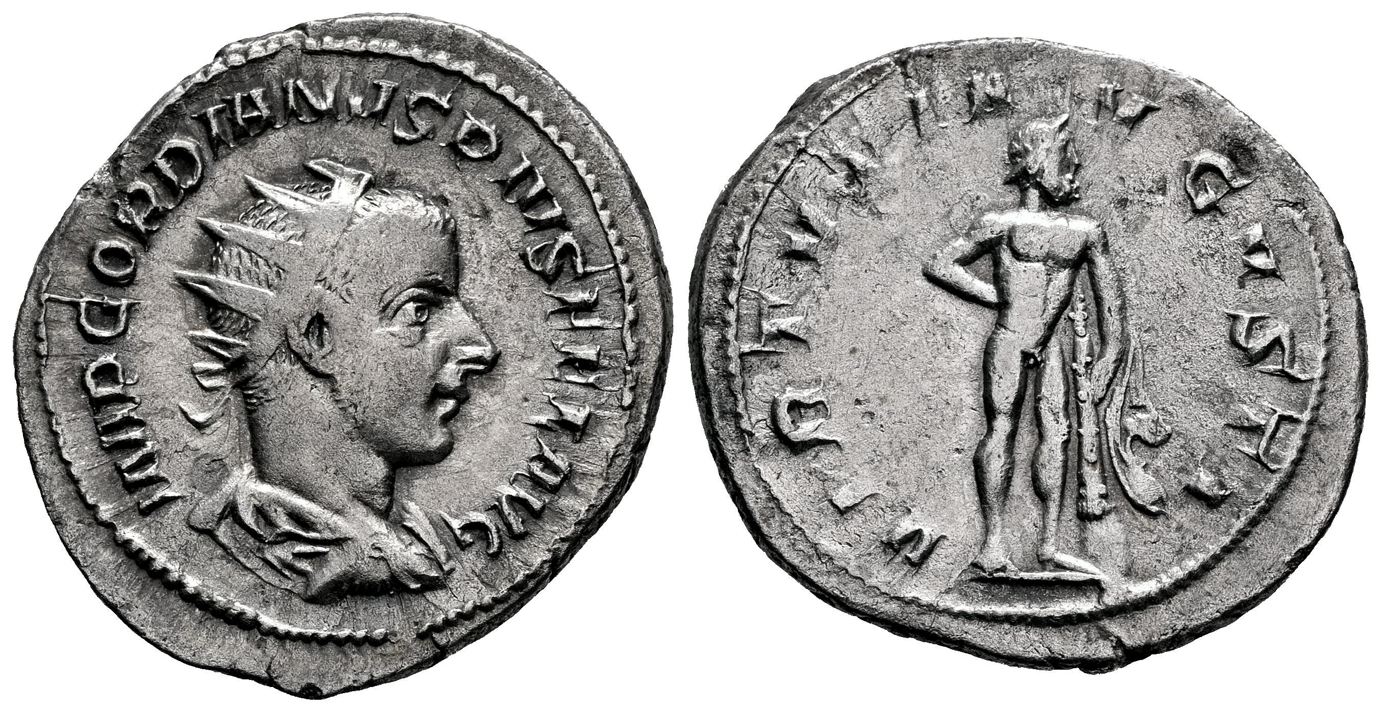 Gordiano III. Antoniniano. 241-243 d.C. Roma. (Ric-IV 95). (Rsc-404). Anv.: IMP GORDIANVS PIVS FEL AVG. Busto radiado, drapeado y con coraza a la derecha. Rev.: VIRTVTI AVGVSTI. Hércules desnudo en pie a derecha, con mano apoyada sobre cadera y la otra sobre clava; piel de león apoyada en roca. Ag. 4,00 g. MBC. Est...50,00.