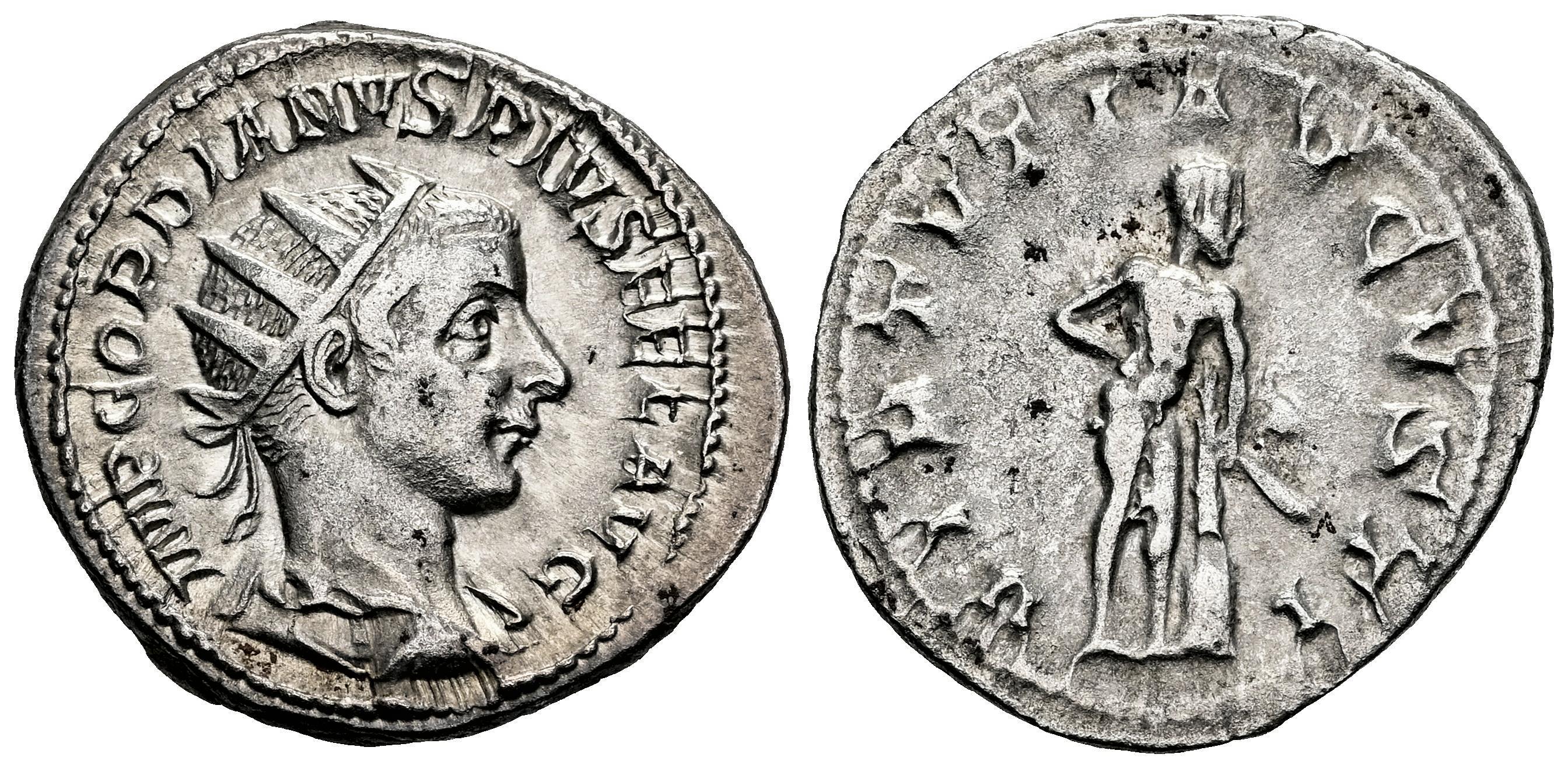 Gordiano III. Antoniniano. 241-243 d.C. Roma. (Ric-IV 95). (Rsc-404). Anv.: IMP GORDIANVS PIVS FEL AVG. Busto radiado, drapeado y con coraza a la derecha. Rev.: VIRTVTI AVGVSTI. Hércules desnudo en pie a derecha, con mano apoyada sobre cadera y la otra sobre clava; piel de león apoyada en roca. Ag. 4,27 g. Cuño del reverso gastado. Ex Monedalia 3 (28/05/2020), lote 164. MBC+/MBC. Est...50,00.