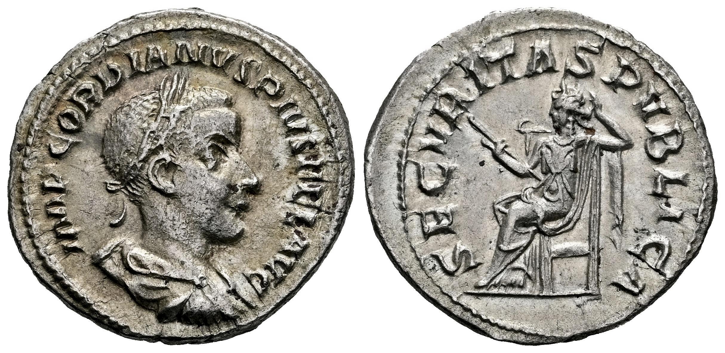 Gordiano III. Denario. 241 d.C. Roma. (Ric-IV 130). (Rsc-340). Anv.: IMP GORDIANVS PIVS FEL AVG. Busto laureado, drapeado y con coraza a la derecha. Rev.: SECVRITAS PVBLICA. Securitas sedente a la izquierda, sosteniendo un cetro y apoyando la cabeza sobre la mano. Ag. 3,14 g. Conserva la etiqueta del coleccionista. MBC/EBC. Est...100,00.