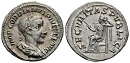 Gordiano III. Denario. 241 d.C. Roma. (Ric-IV 130). (Rsc-340). Anv.: IMP GORDIANVS PIVS FEL AVG. Busto laureado, drapeado y con coraza a la derecha. Rev.: SECVRITAS PVBLICA. Securitas sedente a la izquierda, sosteniendo un cetro y apoyando la cabeza sobre la mano. Ag. 3,14 g. Conserva la etiqueta del coleccionista. MBC/EBC. Est...100,00.