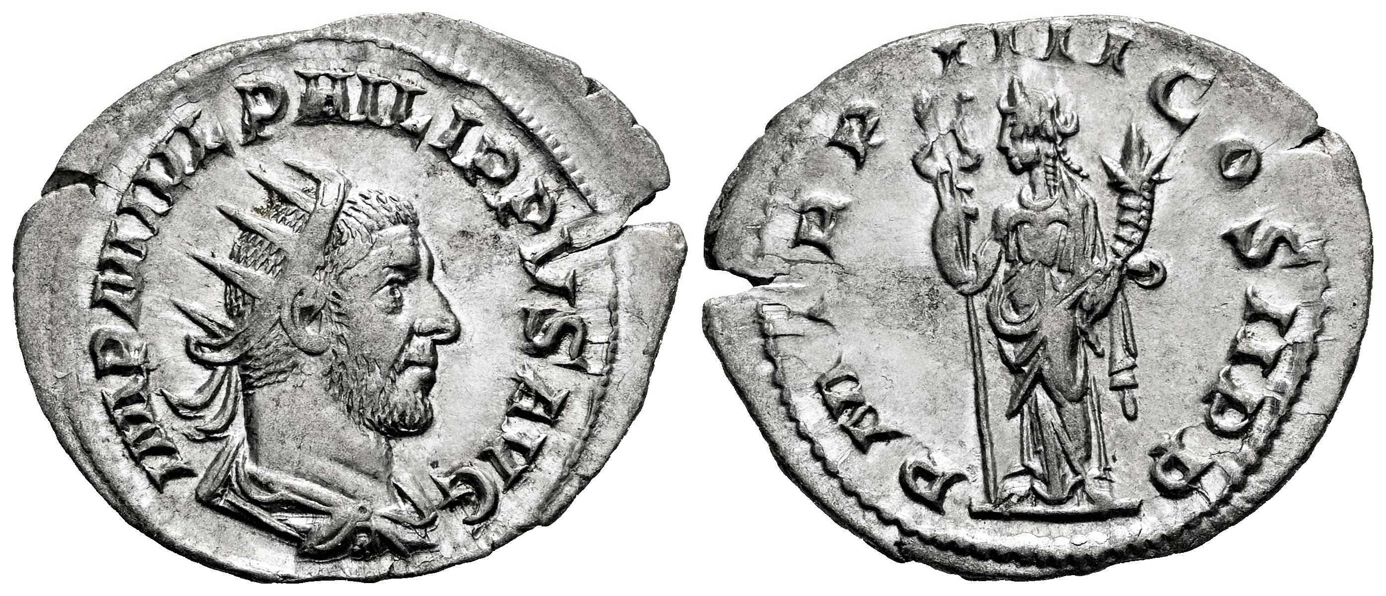 Filipo I. Antoniniano. 244-249 d.C. Roma. (Ric-IV 5). (Rsc-137). Anv.: IMP M IVL PHILIPPVS AVG. Busto radiado y con coraza a la derecha. Rev.: PM TR P IIII COS P P. Felicitas en pie a la izquierda sosteniendo un caduceo y una cornucopia. Ag. 2,78 g. Restos de brillo original. EBC. Est...80,00.