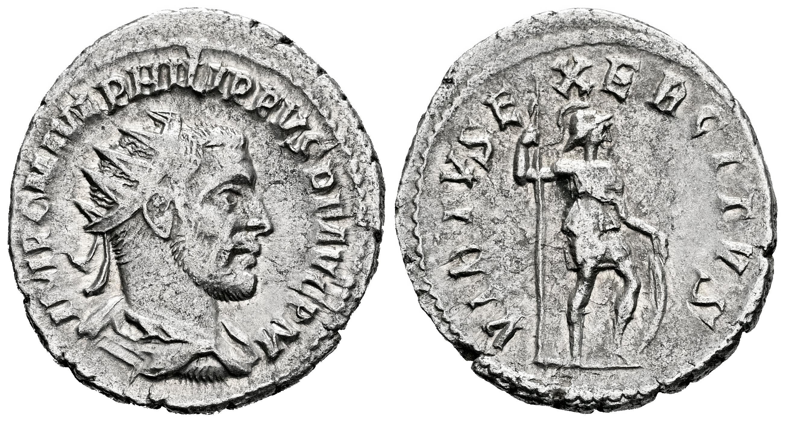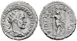 Filipo I. Antoniniano. 244 d.C. Antioquía. (Ric-IV 71). Anv.: IMP C M IVL PHILIPPVS P F AVG P M. Busto radiado, drapeado y con coraza a derecha. Rev.: VIRTVS EXERCITVS. Virtus en pie a derecha, portando lanza y descansando mano izquierda sobre escudo. Ag. 4,35 g. MBC+. Est...50,00.