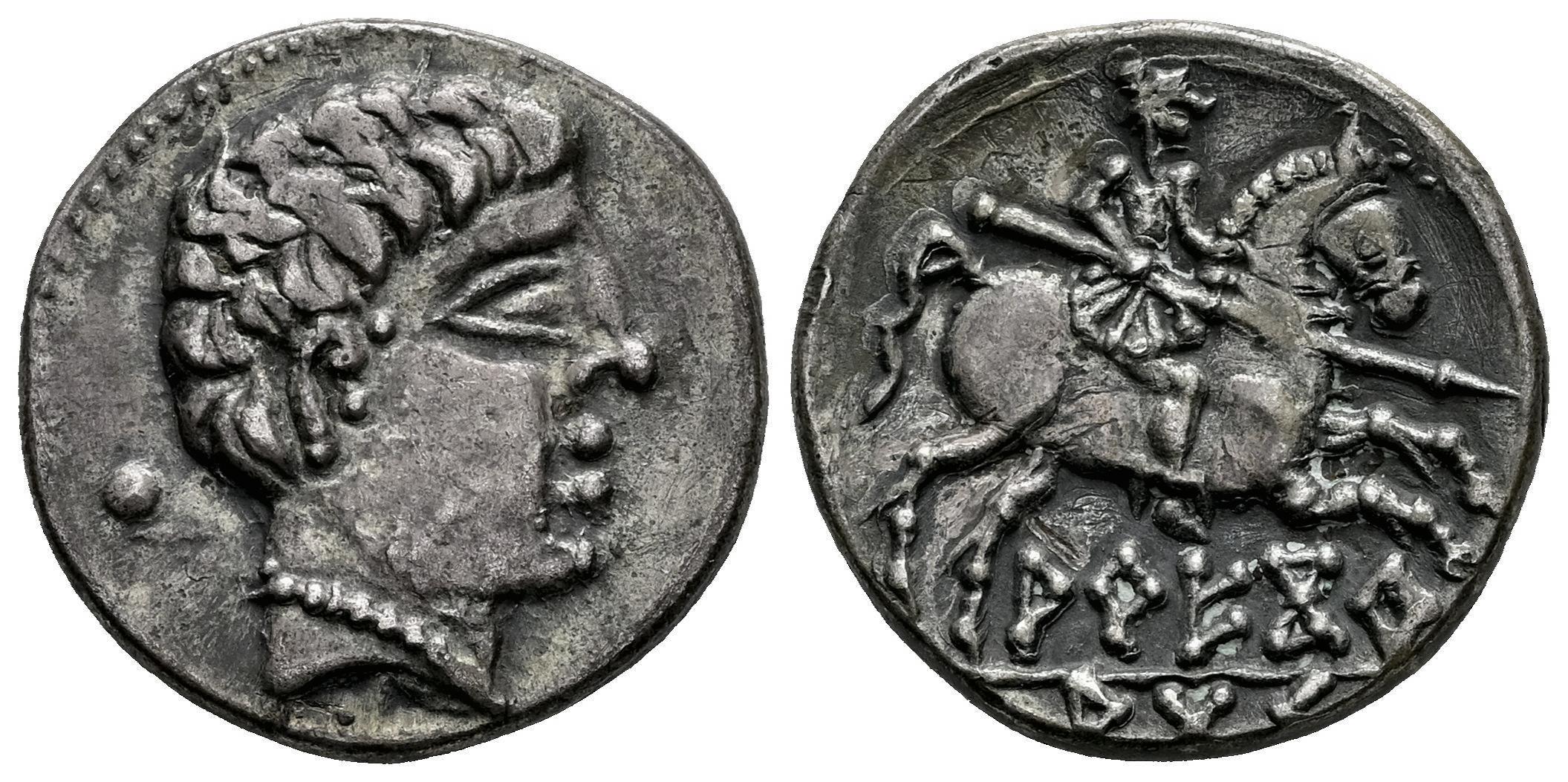 Areikoratikos-Arekoratas. Denario. 150-20 a.C. Ágreda (Soria). (Abh-110). (Acip-1760). (C-17). Anv.: Cabeza masculina a derecha, detrás letra ibérica KU con punto central. Rev.: Jinete con lanza y asomando un pie a derecha, leyenda AREKORATAS con línea de separación, los dos últimos signos unidos. Ae. 3,65 g. Ligera pátina. MBC+. Est...350,00.