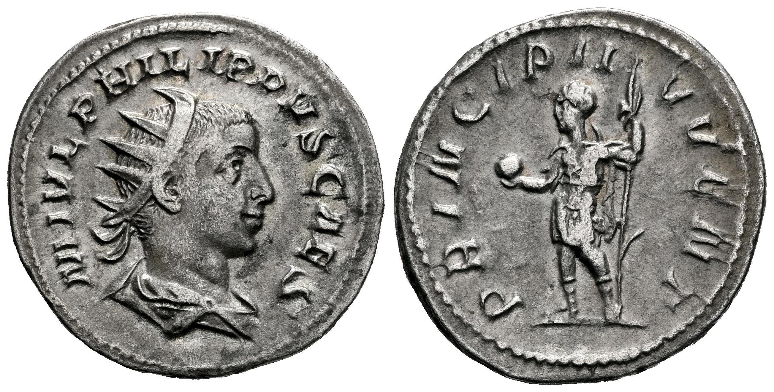 Filipo II. Antoniniano. 244-246 d.C. Roma. (Ric-IV 218d). (Rsc-48). Anv.: M IVL PHILIPPVS CAES. Busto radiado, drapeado y con coraza a la derecha. Rev.: PRINCIPI IVVENT. Príncipe en pie a la izquierda, sosteniendo un globo y una lanza. Ag. 3,36 g. MBC+/MBC. Est...60,00.