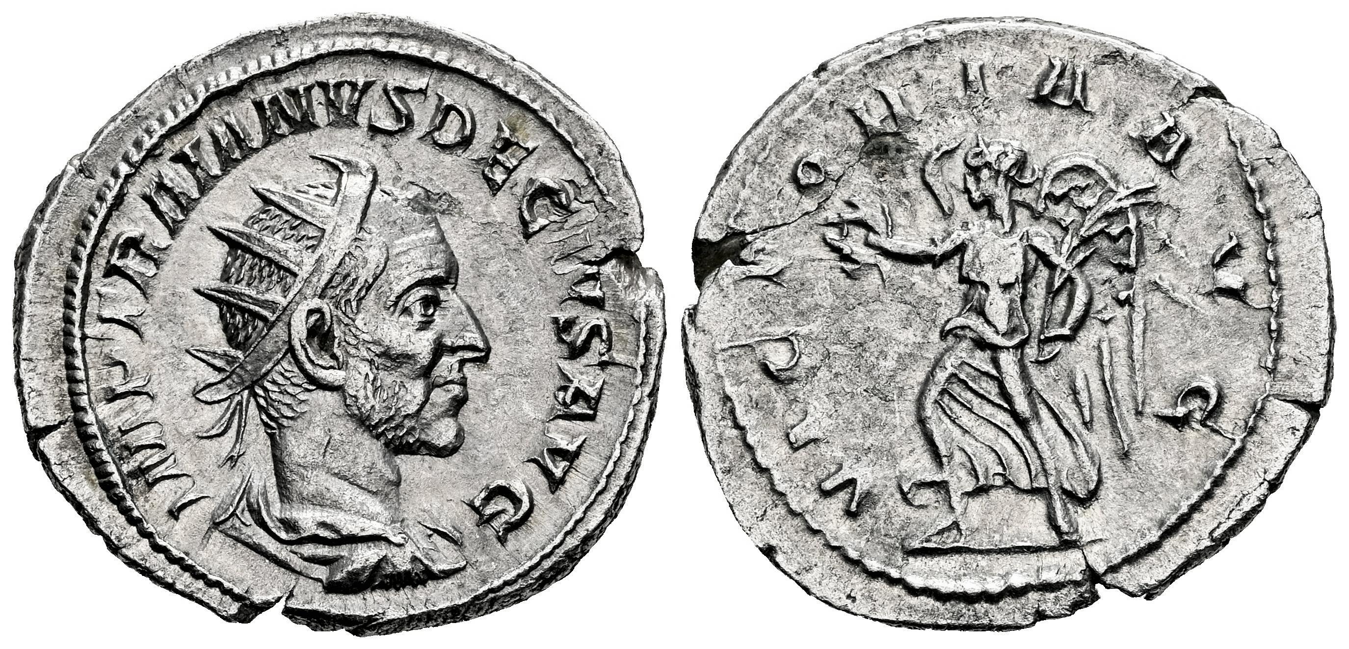 Trajano Decio. Antoniniano. 249-251 d.C. Roma. (Ric-7). (Rsc-111). Anv.: IMP TRAIANVS DECIVS AVG. Busto radiado y con coraza a derecha. Rev.: VICTORIA AVG. Victoria avanzando a la izquierda, portando corona y palma. Ag. 4,05 g. Raro con esta leyenda de anverso. EBC/EBC-. Est...60,00.