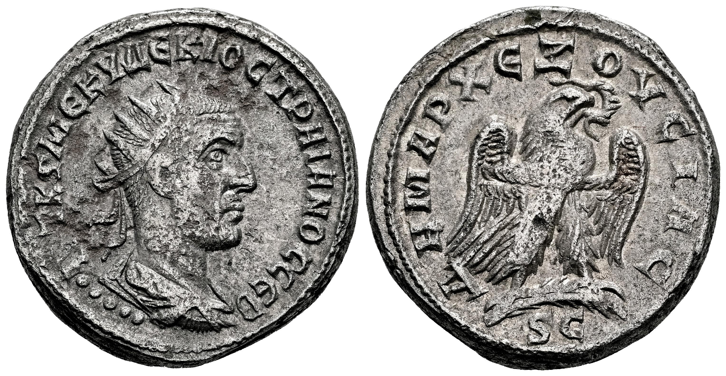 Trajano Decio. Seleucis y Pieria. Tetradracma. 249-250 d.C. Antioquía. (McAlee-1113e). (Prieur-532). Anv.: AYT K Γ MЄ KY ΔЄKIOC TRAIANOC CEB. Busto laureado, drapeado y con coraza a la derecha; cinco puntos debajo. Rev.: ΔHMAPX EΞOYCIAC. Águila en pie sobre una hoja de palma, con las alas extendidas, sosteniendo una corona en el pico, SC en exergo. Ve. 12,55 g. MBC+. Est...140,00.